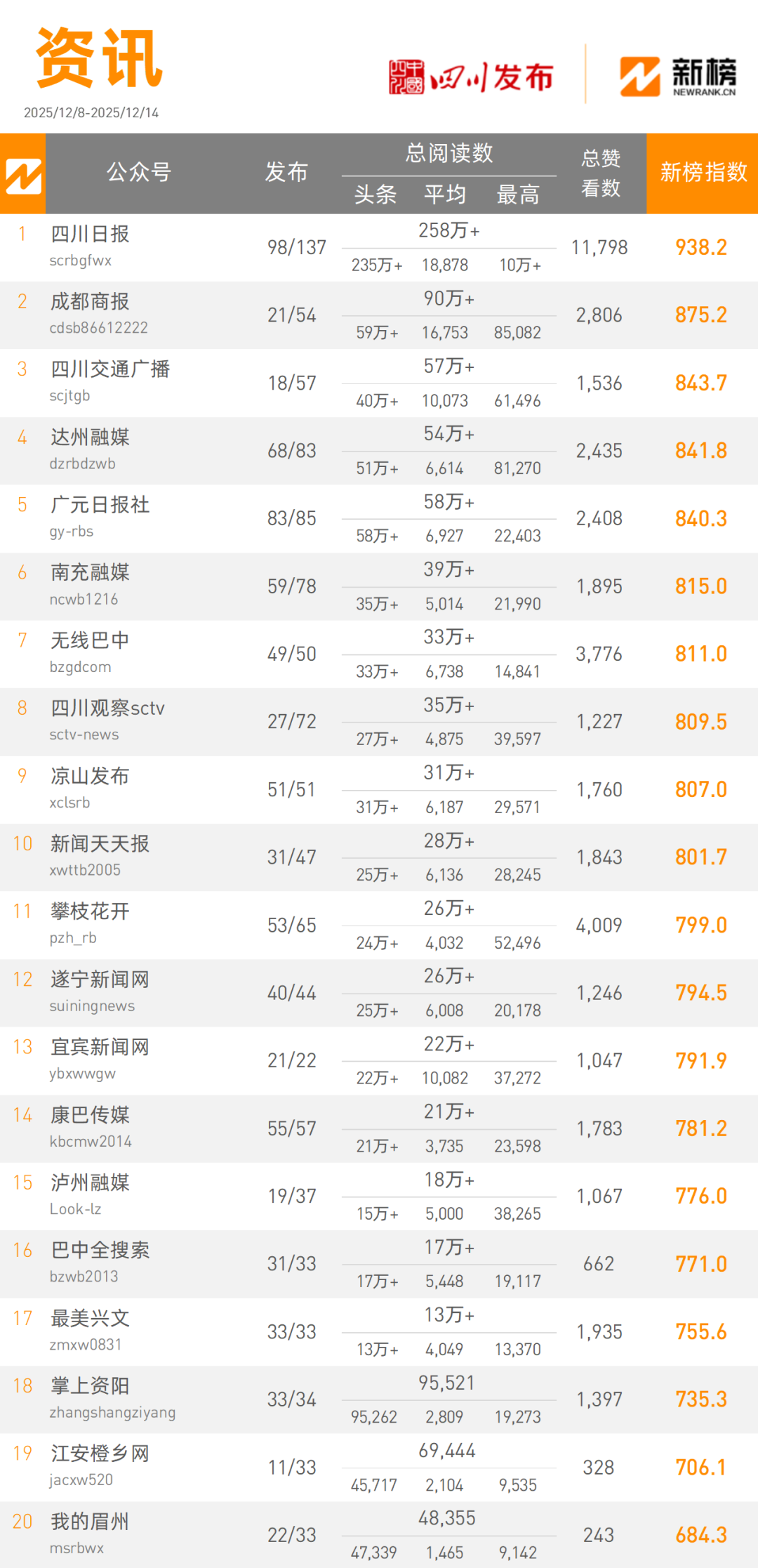 “四川日报”以2580000+次阅读量总数,938.2的新榜指数获得资讯类榜单第一名,“成都商报”本周以900000+次阅读量总数,875.2的新榜指数占据资讯类榜单第二名。