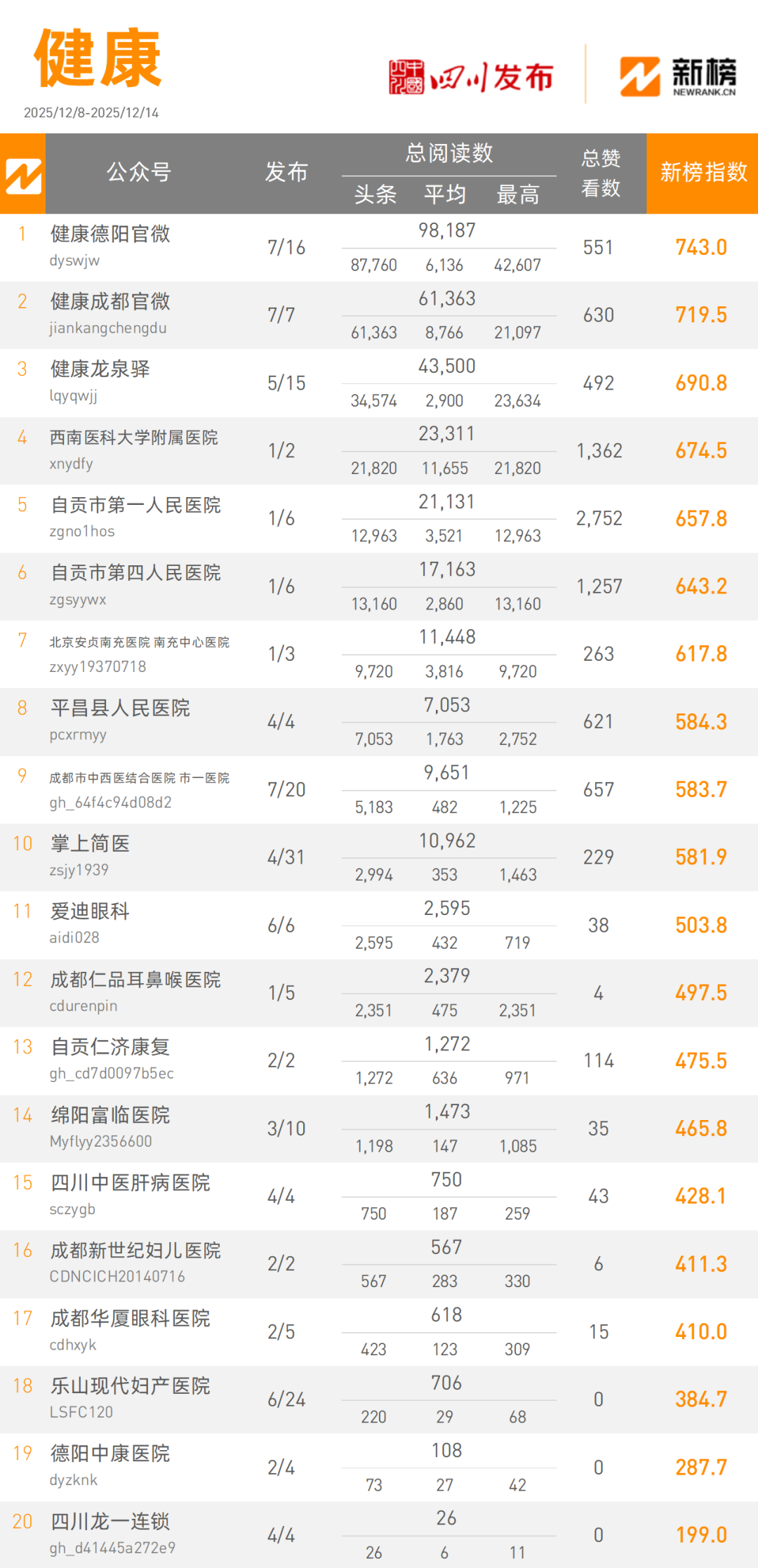 “健康德阳官微”本周以98187次阅读量总数,743.0的新榜指数占据健康类榜单冠军宝座,“健康成都官微”凭借61363阅读量总数,以719.5的新榜指数获得健康类榜单亚军。