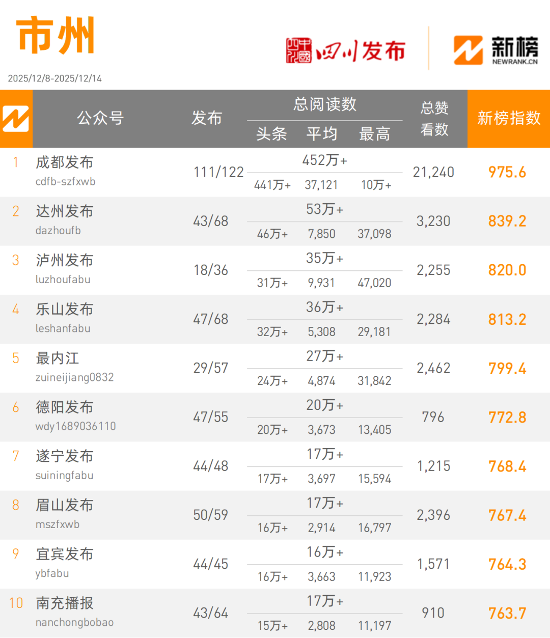 在本周市(州)榜单中,“成都发布”发文122篇,以4520000+次阅读量总数975.6的新榜指数摘得市州类榜单桂冠;“达州发布”发文68篇,以530000+次阅读量总数,839.2的新榜指数获得市(州)类榜单亚军。