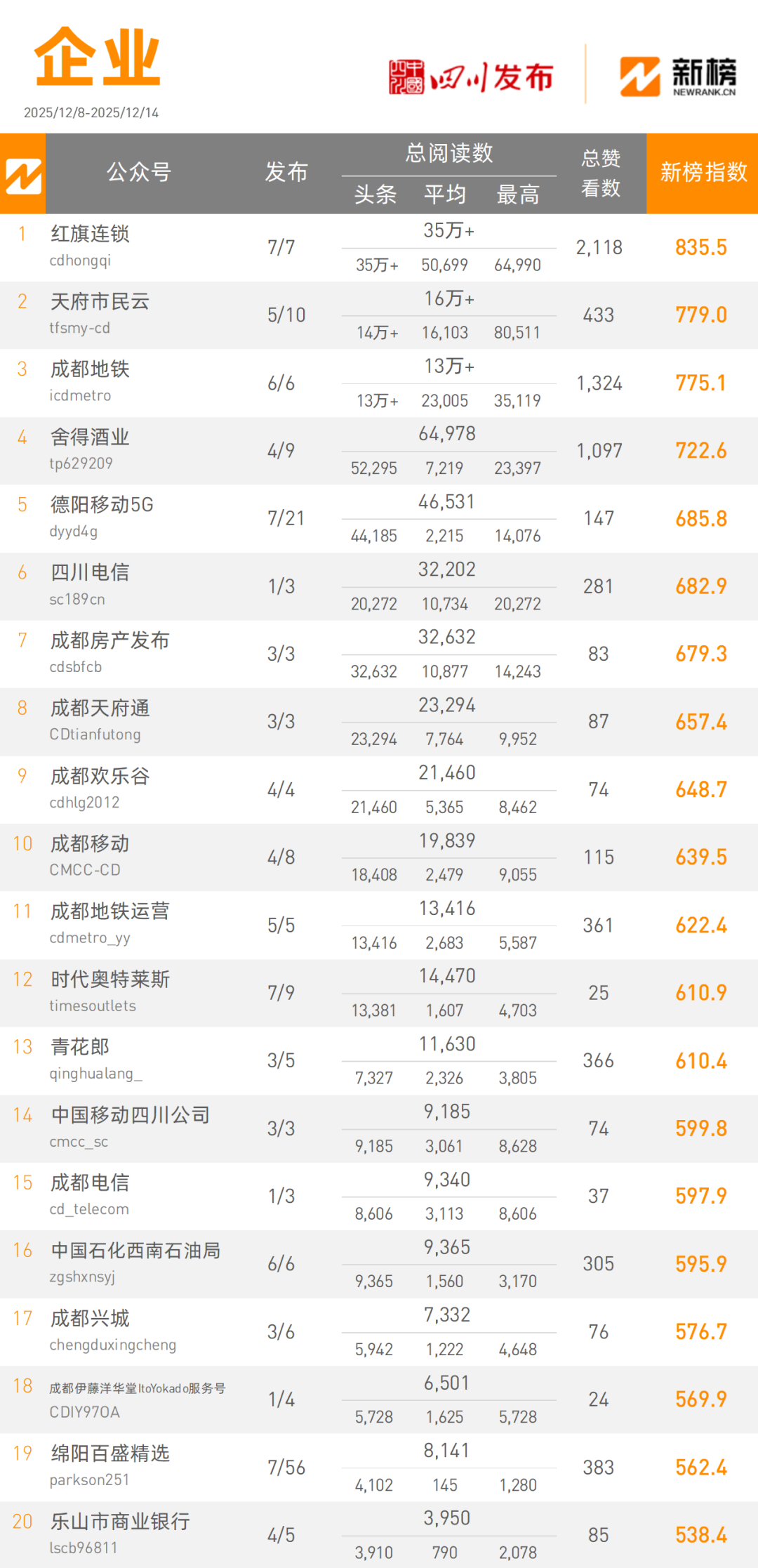 “红旗连锁”本周发文7篇,以350000+次阅读量总数坐上企业类榜单头把交椅,“天府市民云”本周发文10篇,以160000+次阅读量总数位居企业类榜单次席。