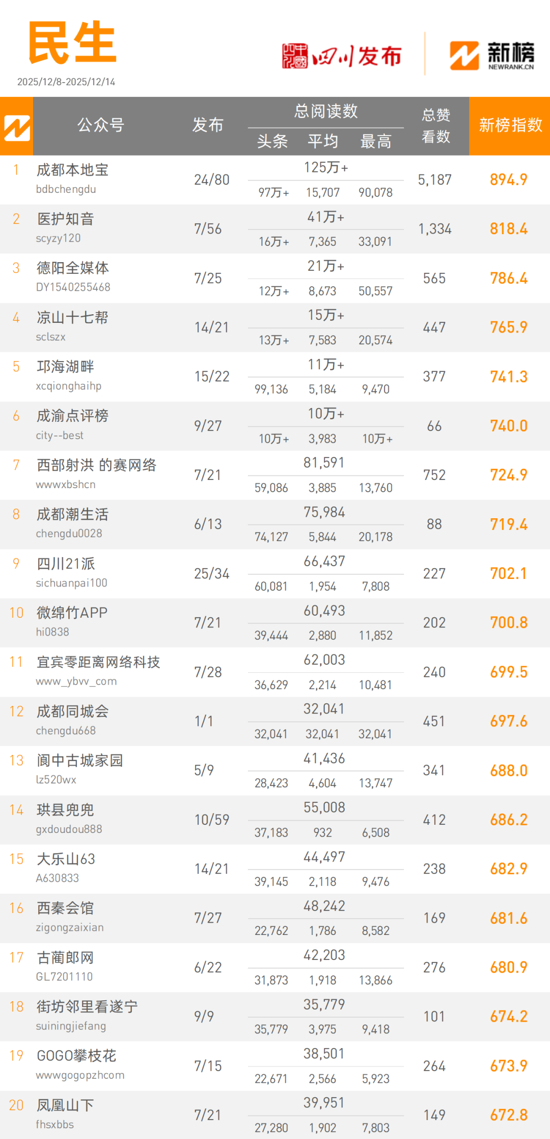 “成都本地宝”本周以1250000+次阅读量总数摘得民生类榜单桂冠,“医护知音”本周以410000+次阅读量总数,818.4的新榜指数占据民生类榜单第二名。