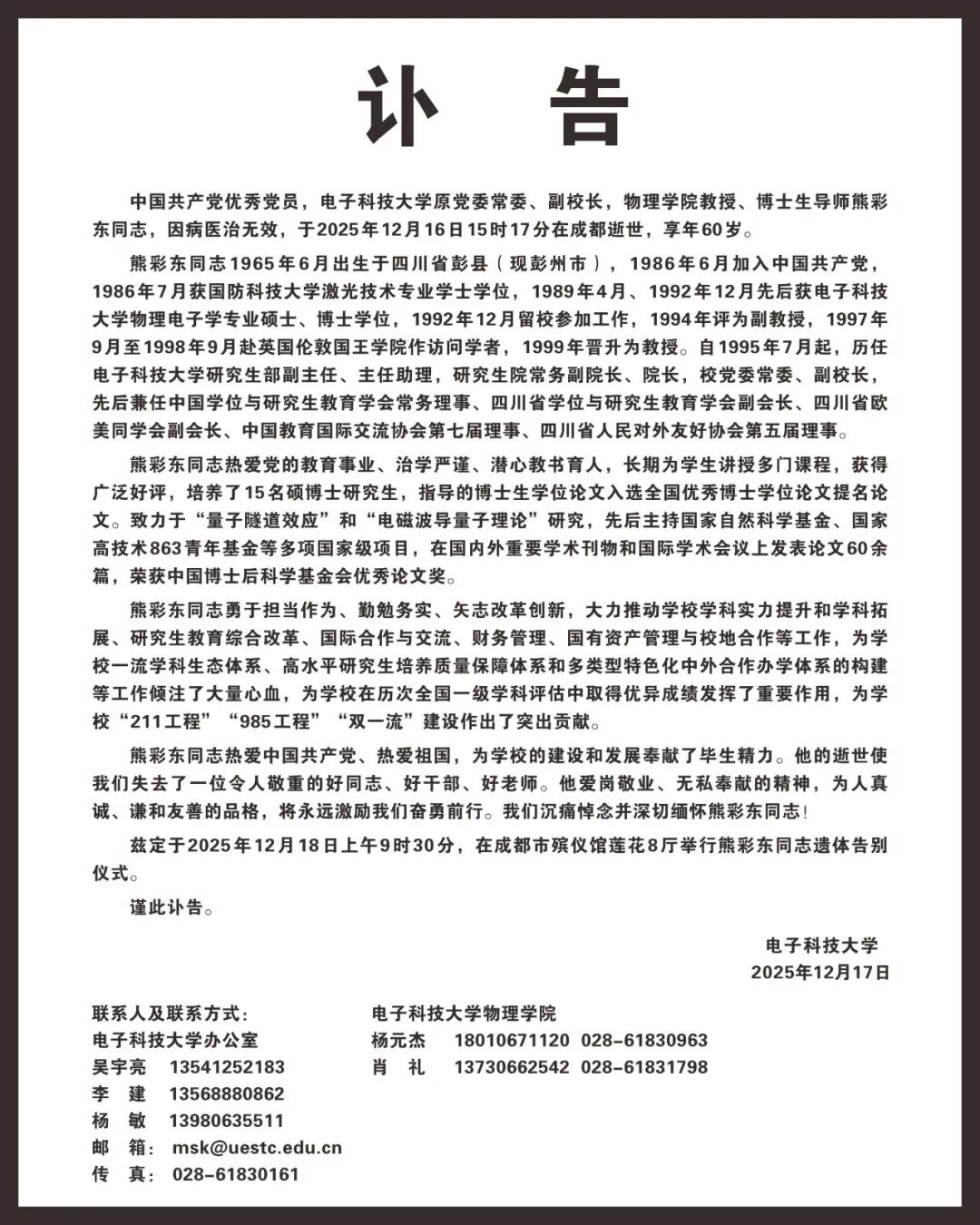 今日,电子科技大学物理学院官网发布讣告,电子科技大学原党委常委、副校长,物理学院教授、博士生导师熊彩东同志,因病医治无效,于2025年12月16日15时17分在成都逝世,享年60岁。