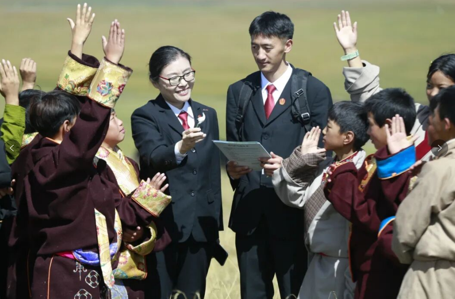 “熊猫绿盾”团队在草原上开展关于野生动物保护的双语普法课
