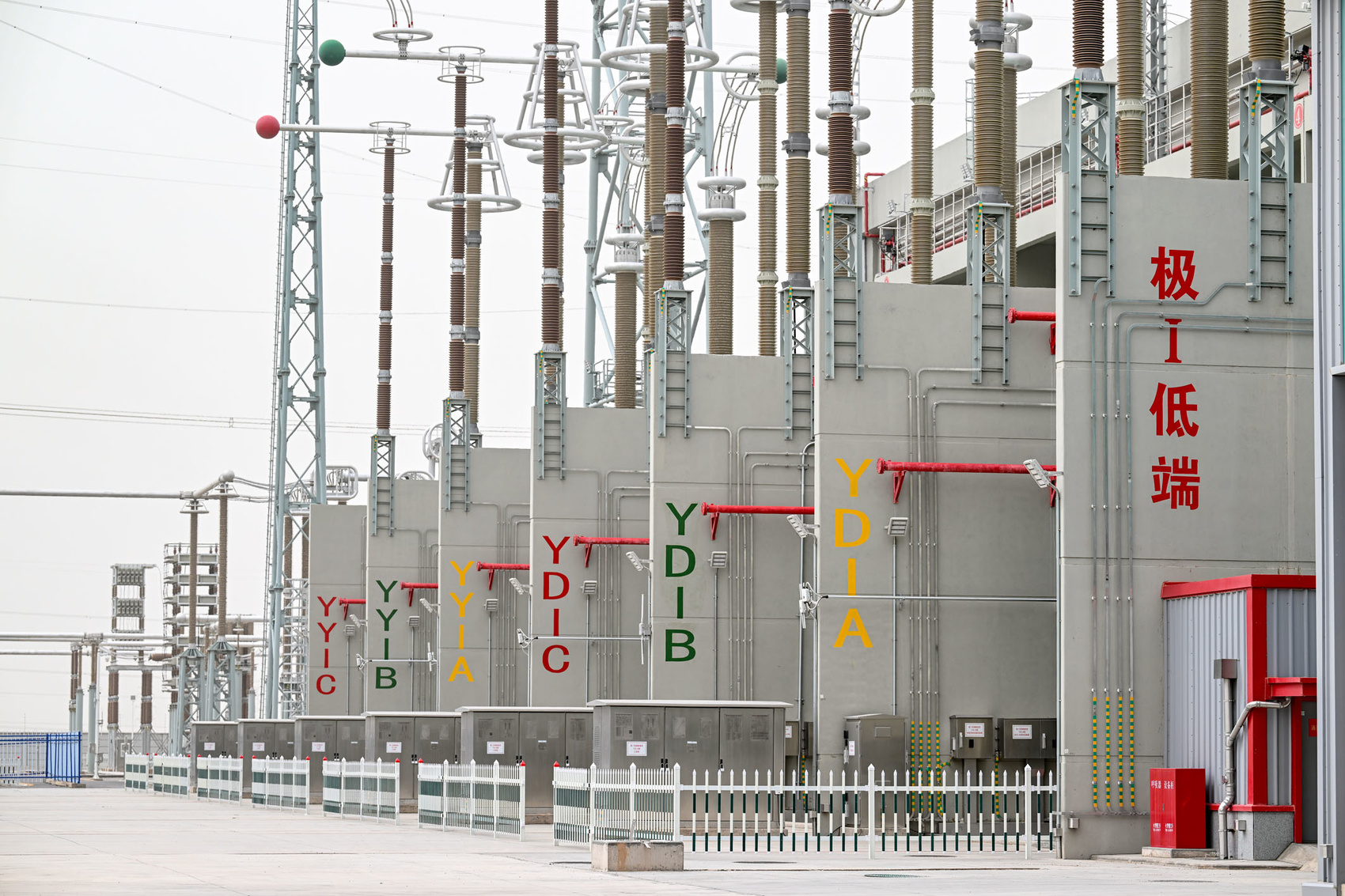 “宁电入湘”工程中宁换流站内的极Ⅰ低端换流变广场。来源新华社