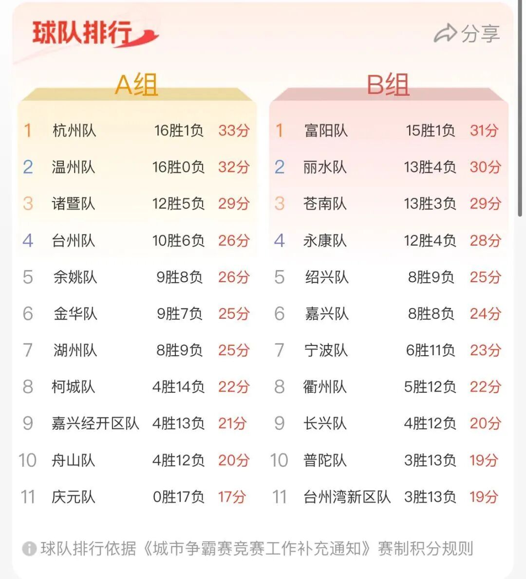 12月17日晚,浙BA城市争霸赛第十九轮继续进行,柯城队主场迎战湖州队。最终,湖州队以80:64客场战胜柯城。昨晚比赛后,最新排行榜如下: