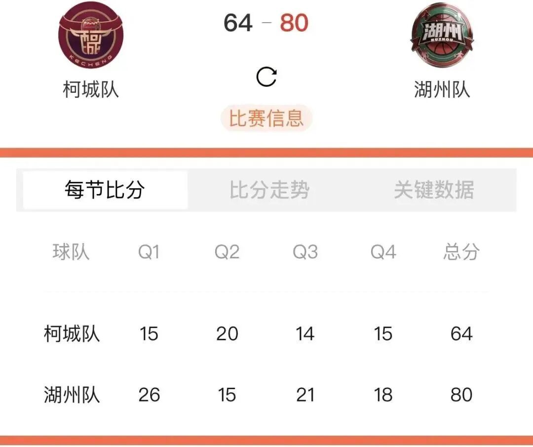 本场比赛后,柯城队的战绩为4胜14负积22分,湖州队的战绩为8胜9负积25分。比赛精彩瞬间↓