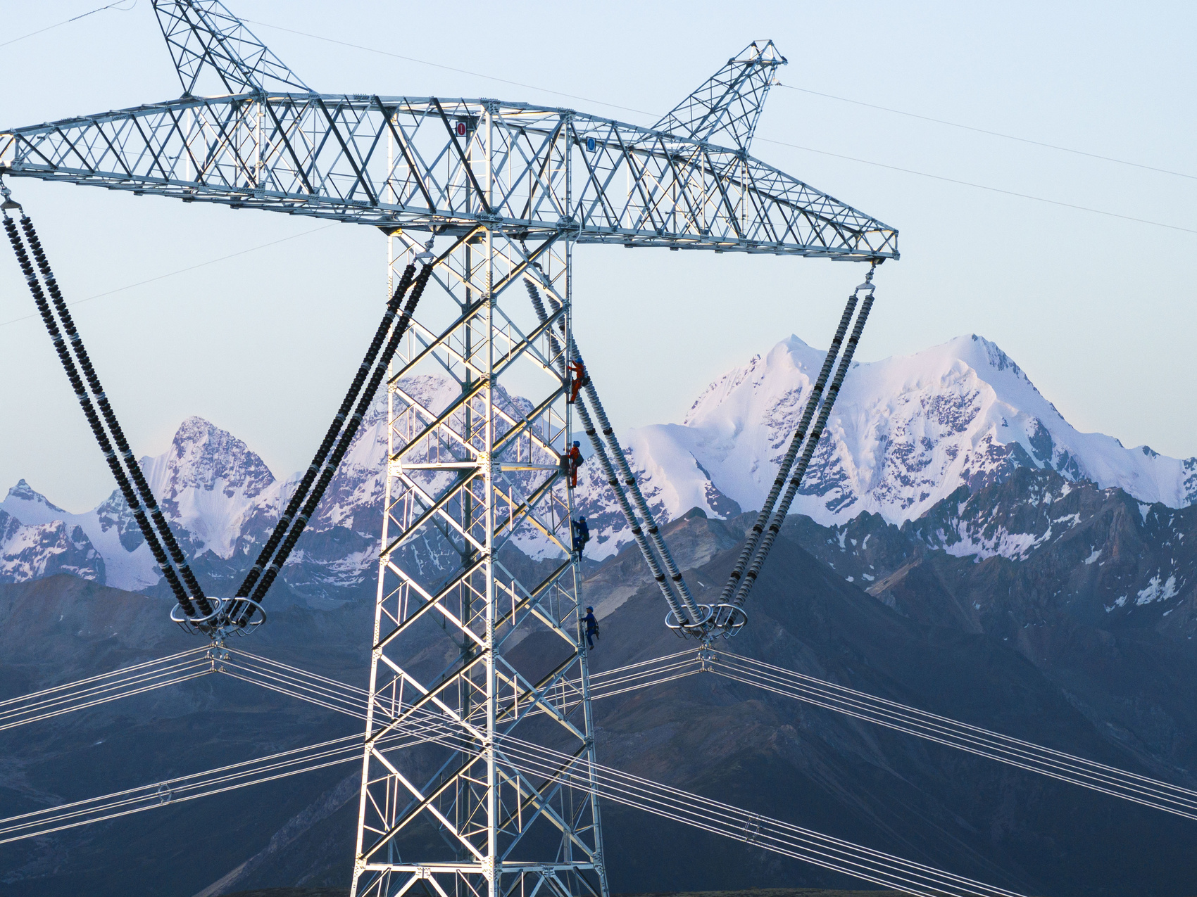 作业人员在金上—湖北特高压工程四川甘孜段登塔开展线路设备设施验收工作。(郑自豪 摄)