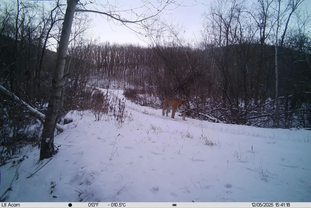 近日,被成功救助放归的野生东北虎“完达山1号”,再度在黑龙江省东宁市区域现身。