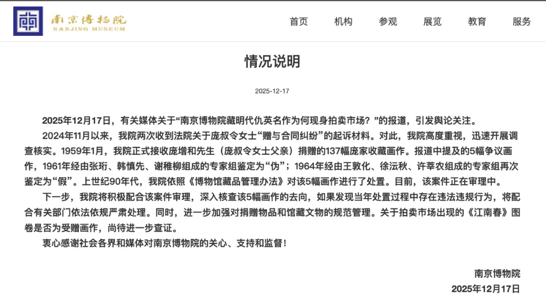 12月17日,有关媒体关于“南京博物院藏明代仇英名作为何现身拍卖市场?”的报道,引发舆论关注。
