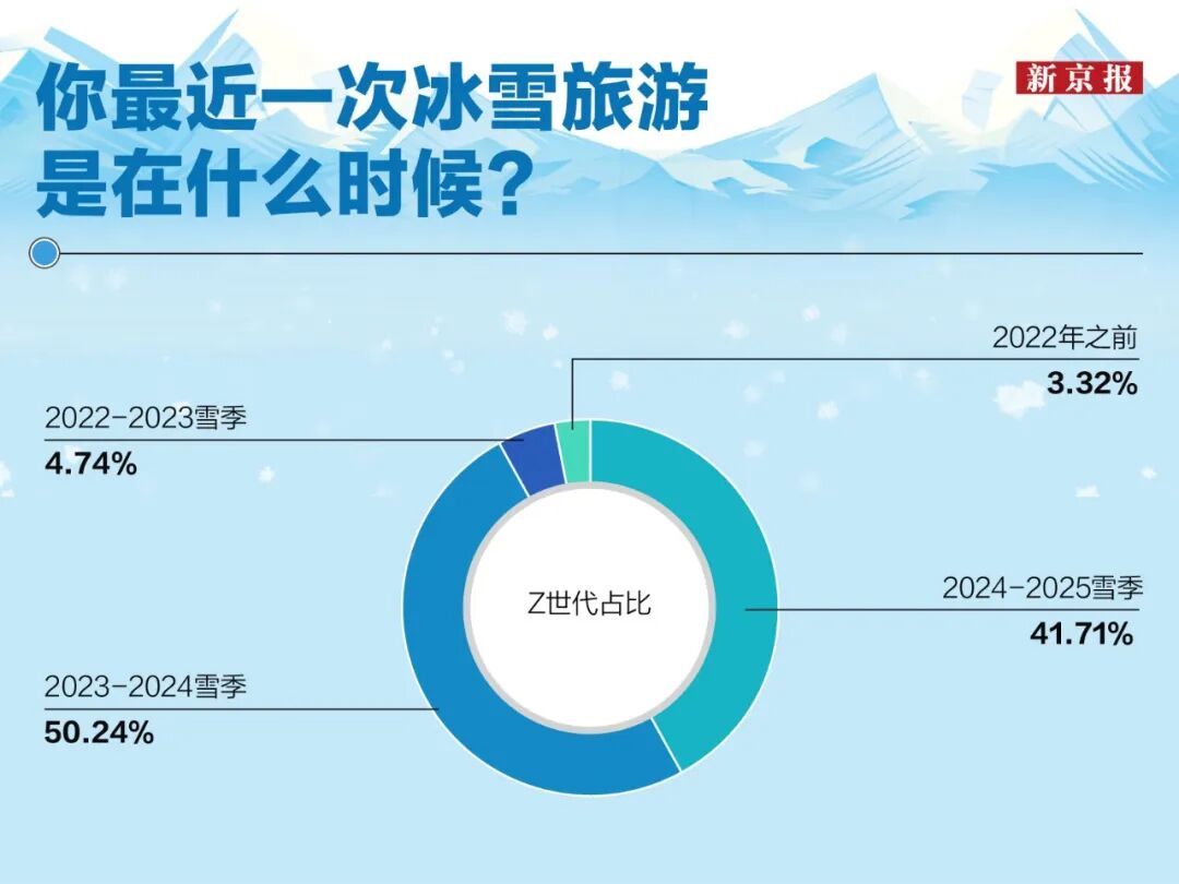 更值得关注的是,Z世代的冰雪体验呈现出近乎“压缩式”的时间集中。《报告》显示,在年轻人最近一次冰雪旅行中,2024年–2025年雪季占41.71%,2023年–2024年雪季占50.24%,两者合计接近92%。换句话说,Z世代的冰雪记忆几乎都发生在过去两年——这批涌向雪场的年轻人,绝大多数是“尔滨效应”催生的新玩家。