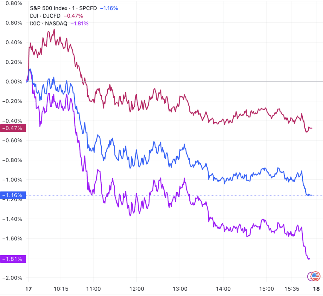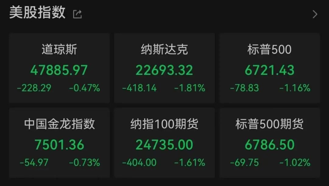 美东时间12月17日(周三),美股三大指数集体收跌。截至收盘,道琼斯指数下跌0.47%,标普500指数下跌1.16%,纳斯达克指数下跌1.81%。
