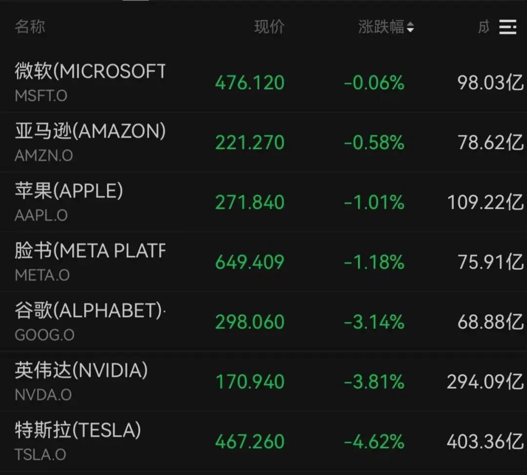 美股科技“七巨头”齐跌,部分个股跌幅较大,特斯拉下跌4.62%,英伟达下跌3.81%,谷歌下跌3.14%。