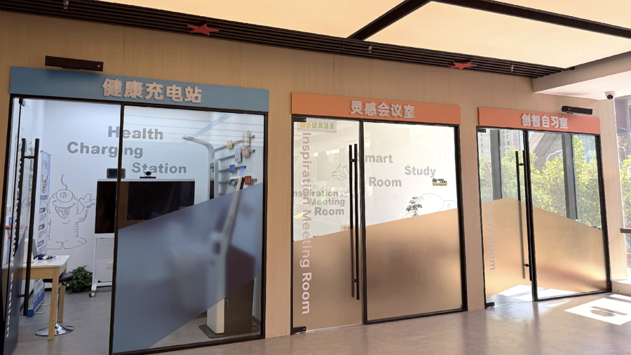 社区入口处的公共空间里,有一台借书机、一间健康充电站。不同于有的地方借书机因为书籍陈旧而沦为摆设,这里的机器和旁边的书柜上,摆满了“豆瓣评分”top10的书籍。“我们还是希望提供给年轻人他们真正需要的东西。”