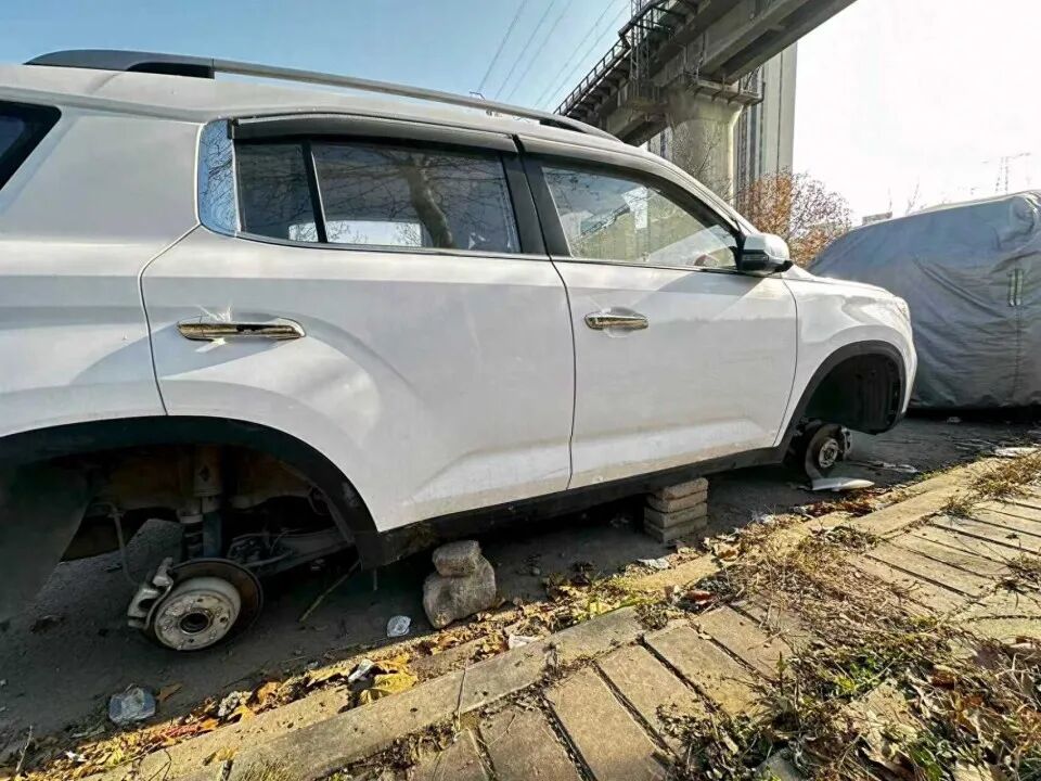据被偷车轮的皖G车主说,他的车在这里停放了十几天,车轮被偷的具体时间不清楚,他从这里路过看到后报警,有民警已经通知他到公安灞桥分局霸陵派出所配合调查,说偷轮胎的已抓到了。