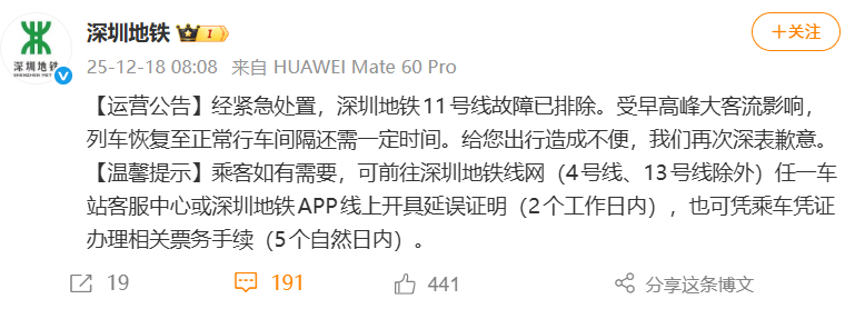 经紧急处置,深圳地铁11号线故障已排除。受早高峰大客流影响,列车恢复至正常行车间隔还需一定时间。给您出行造成不便,我们再次深表歉意。