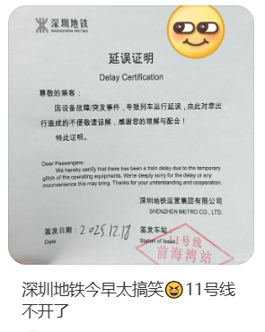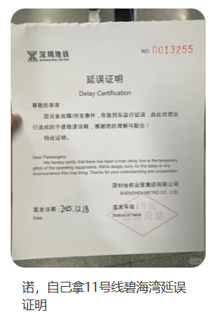乘客如有需要,可前往深圳地铁线网(4号线、13号线除外)任一车站客服中心或深圳地铁APP线上开具延误证明(2个工作日内),也可凭乘车凭证办理相关票务手续(5个自然日内)。