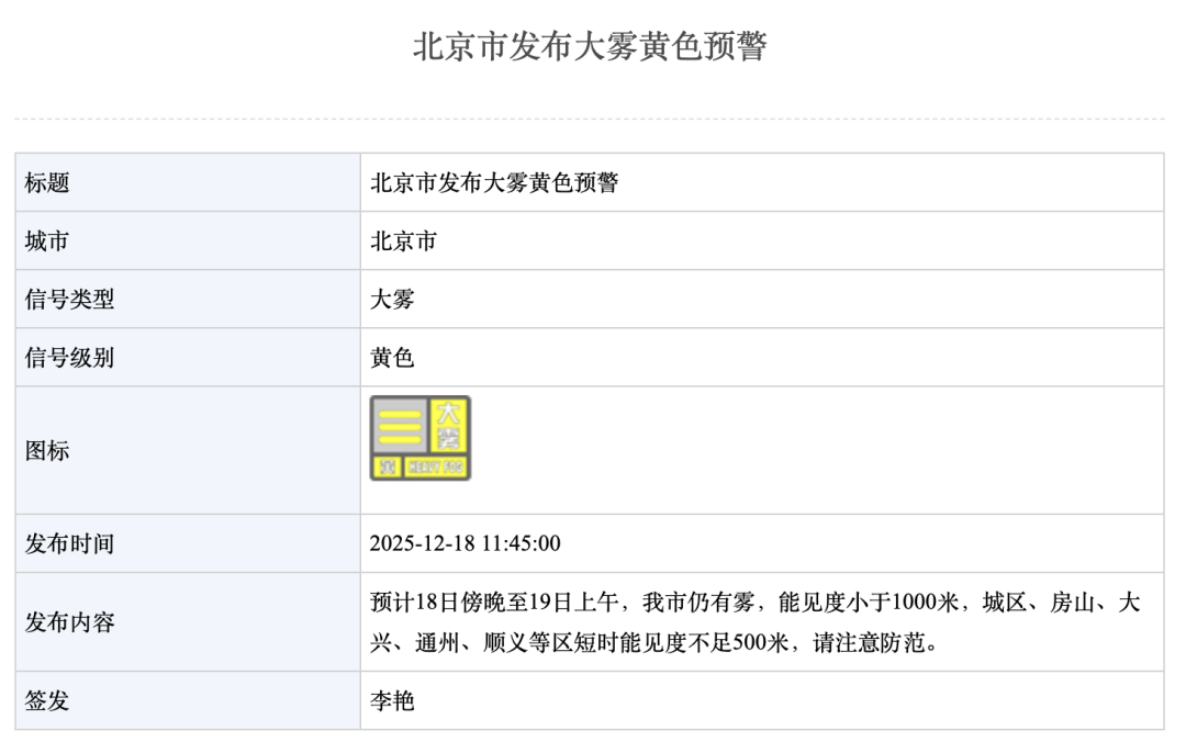 12月18日11时45分,北京市继续发布大雾黄色预警:预计12月18日傍晚至19日上午,北京市仍有雾,能见度小于1000米,城区、房山、大兴、通州、顺义等区短时能见度不足500米,请注意防范。