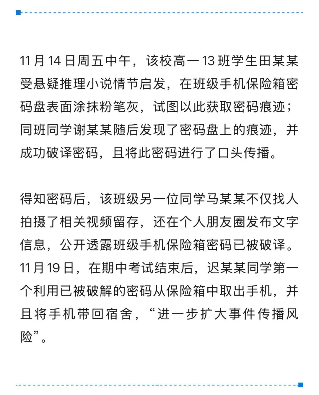 近日,一份文字显示为深圳某高中发布的处分通告在网上流传并引发热议。通告显示,该校高一13班多名学生因受悬疑小说启发,协同破解班级手机保险箱密码、传播密码并取走手机,受到校方纪律处分。