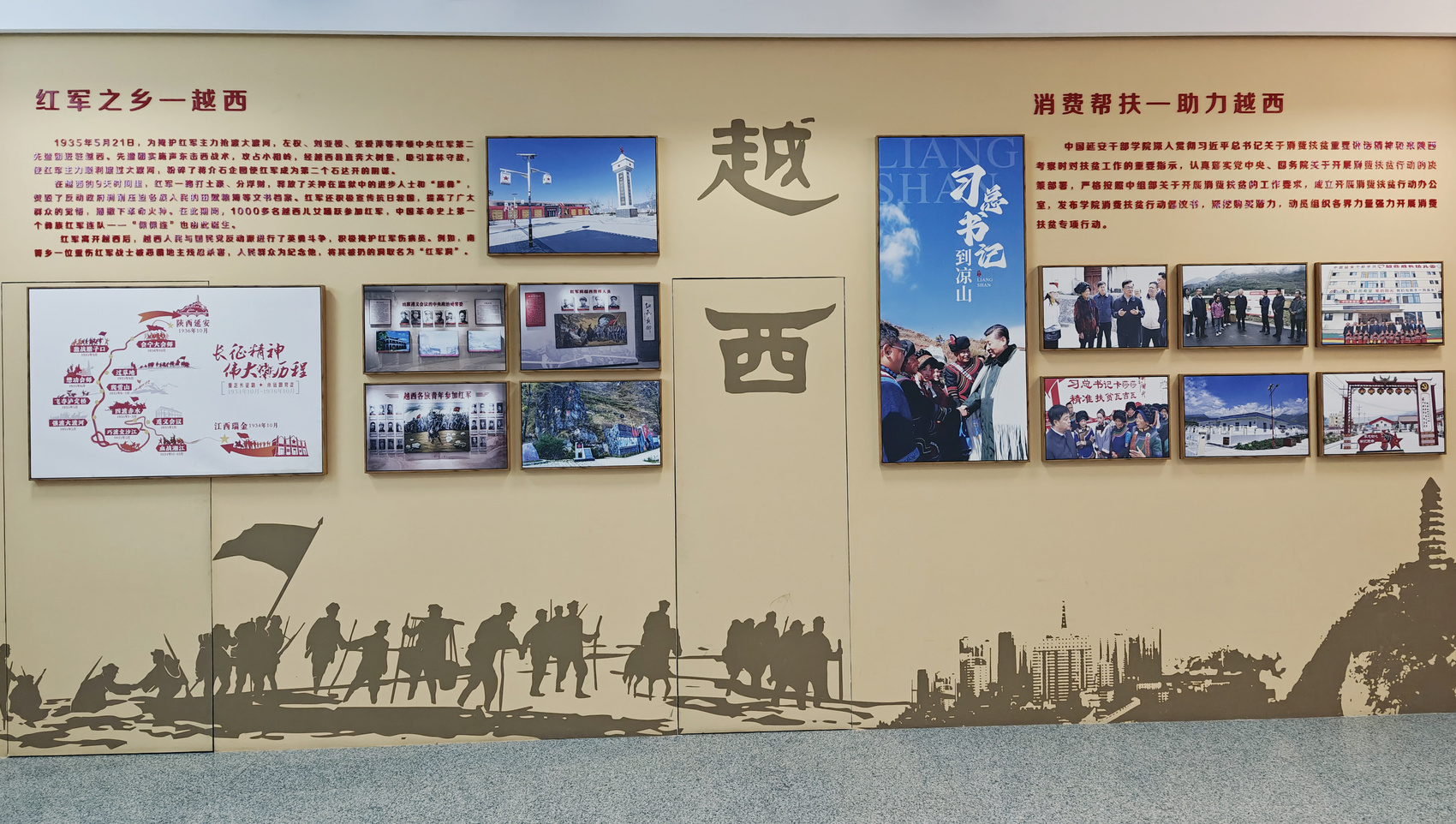 刚踏入超市,视线便被正门两侧的展板牢牢吸引。左侧“红色之乡——越西”的展板上,长征路线图清晰勾勒,越西各族青年踊跃参加红军的油画,定格着当年彝汉军民同心的热血瞬间;右侧“消费帮扶—助力越西”的展板上,习近平总书记2018年视察大凉山时身披彝族“查尔瓦”与群众亲切交谈的照片映入眼帘;旁边,各级领导深入当地帮扶的照片,串联起新时代的牵挂与行动。