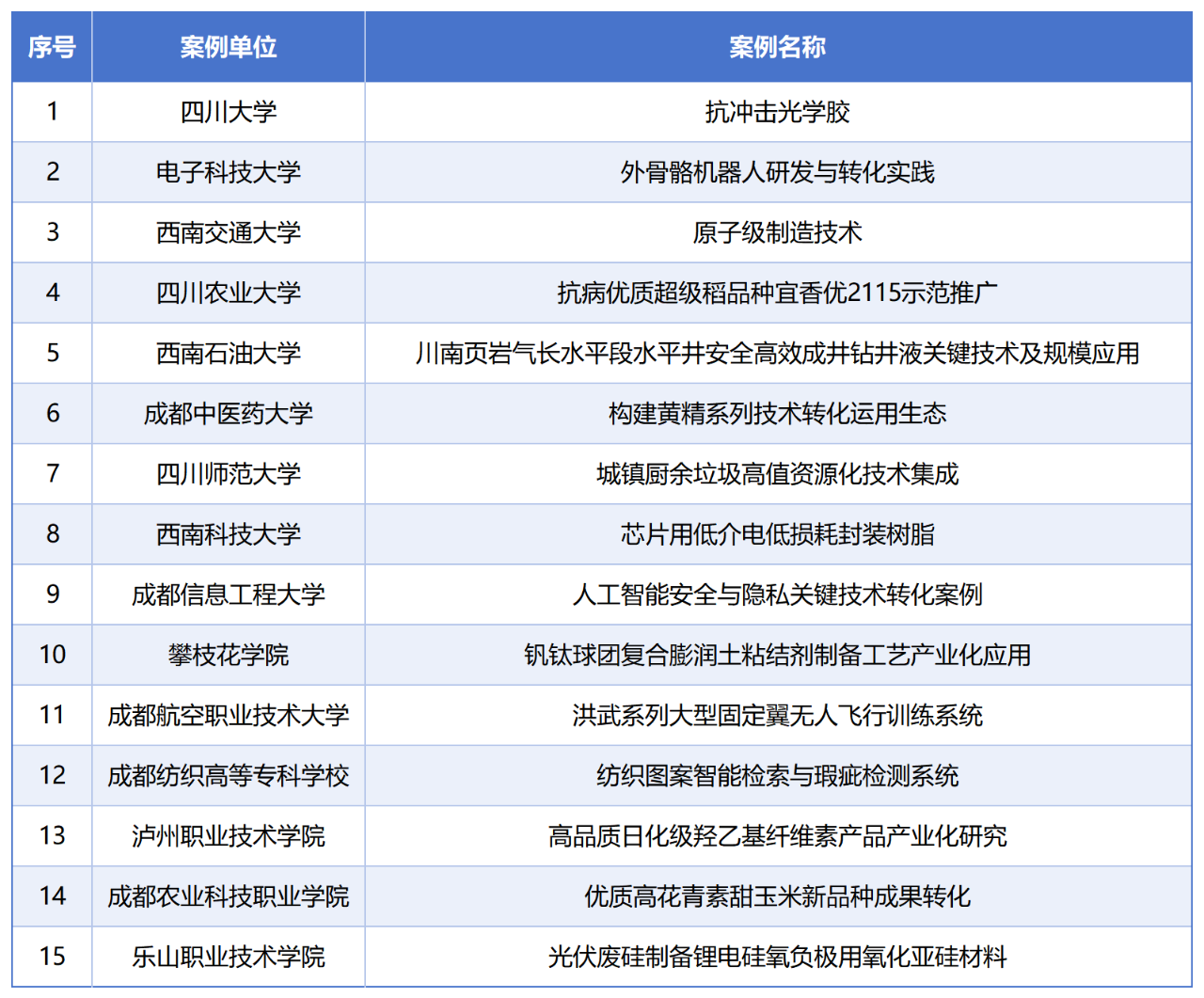 川观新闻记者12月18日从省教育厅获悉,为进一步推动我省高校科技成果转移转化,发挥典型示范引领作用,经高校申报、专家评审网上公示、省教育厅审定等程序,我省遴选出“四川省高校科技成果转化典型案例”15个,具体见下表。