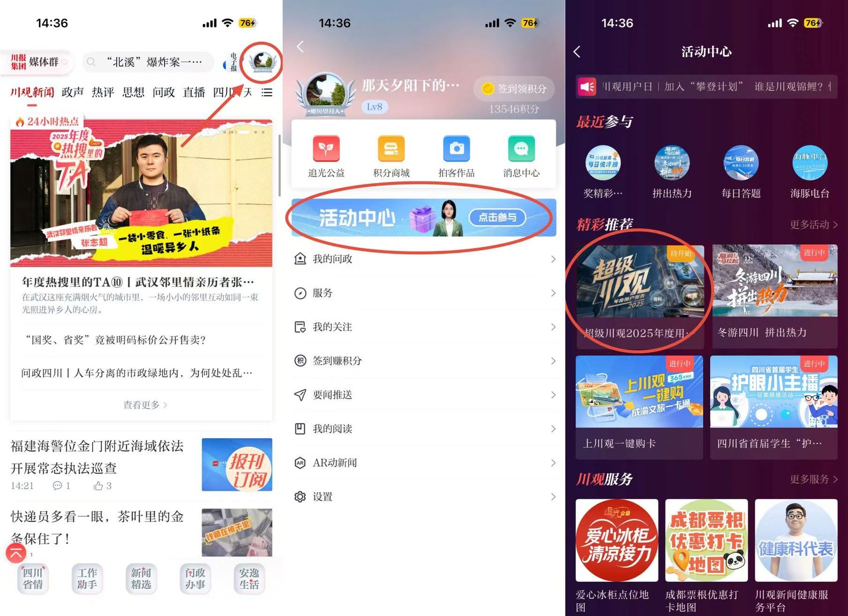 2、点击川观新闻首页右上角头像,点击“活动中心”,找到“超级川观2025年用户年度报告”活动图片,点击参与即可。