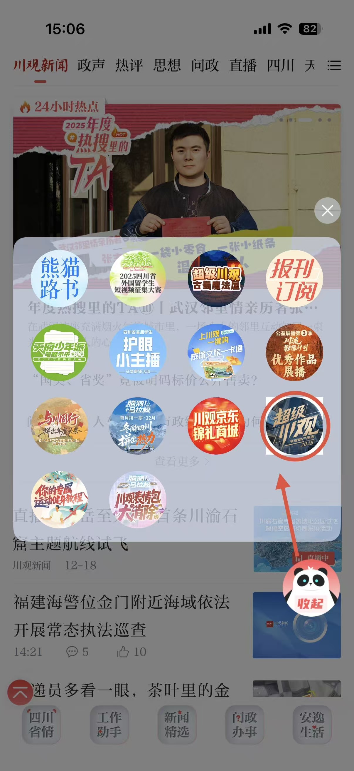 3、在川观新闻首页,点击右下方悬浮球,找到“2025年用户年度报告”活动图片,点击参与活动即可参与;