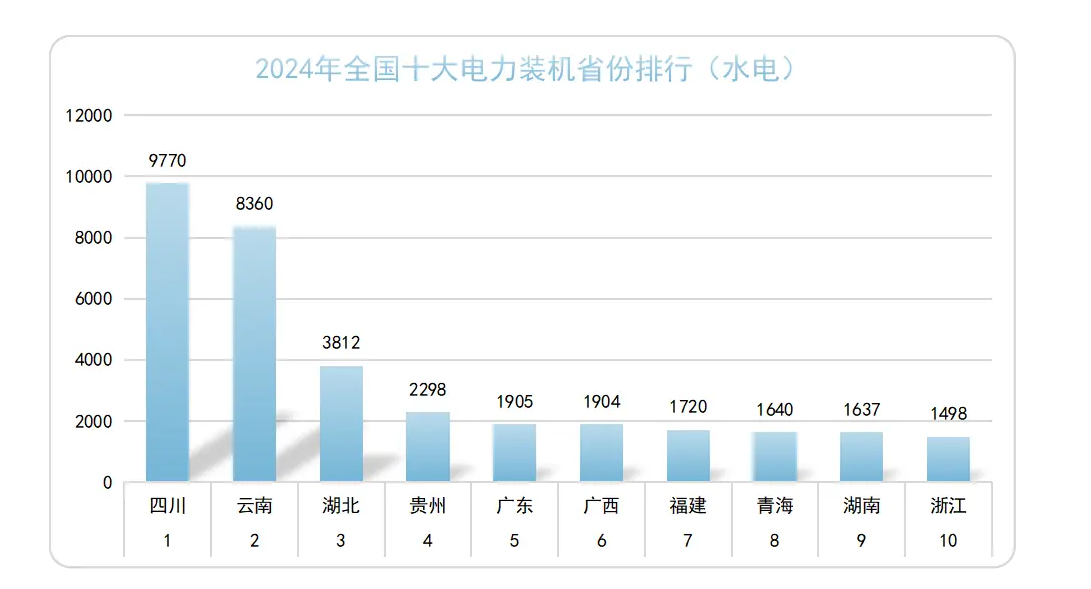 在国内,四川水电装机处于“断层式领先”:比排名第二的云南多出1000多万千瓦,比排名第三的湖北多出约6000万千瓦,甚至超过第四至第八名省份的总和。