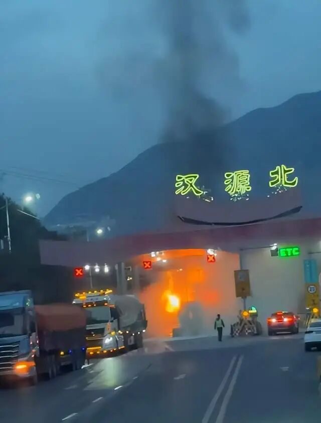 网上多段视频显示,天色暗淡,汉源北收费站旁边火光冲天滚滚浓烟,消防队员很快赶到展开救援,当时情形十分危急。