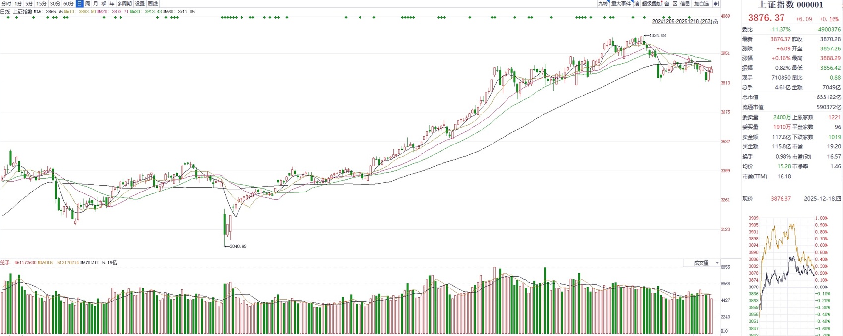 截至12月18日收盘,上证指数报收3876.37点,上涨0.16%;深证成指报收13053.97点,下跌1.29%;创业板指报收3107.06点,下跌2.17%。两市成交量出现近一成的萎缩。