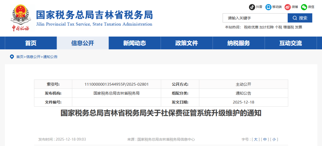 原文标题:国家税务总局吉林省税务局关于社保费征管系统升级维护的通知