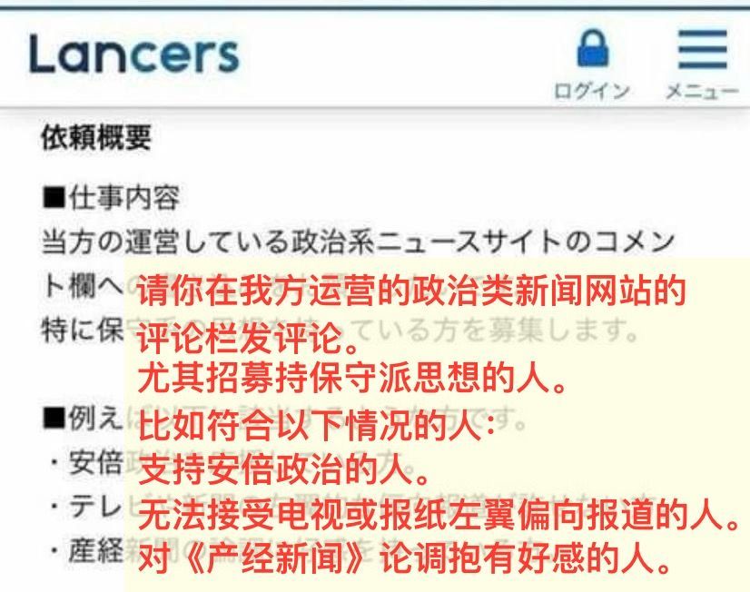 CrowdWorks并非个例。日本另一大型众包平台Lancers上也曾出现类似招募信息,要求给保守派运营的政治类新闻网站撰写留言跟帖,招募对象需“支持(前首相)安倍(晋三)政治”“无法接受电视或报纸左翼倾向报道”“对(右翼媒体)《产经新闻》论调抱有好感”等。