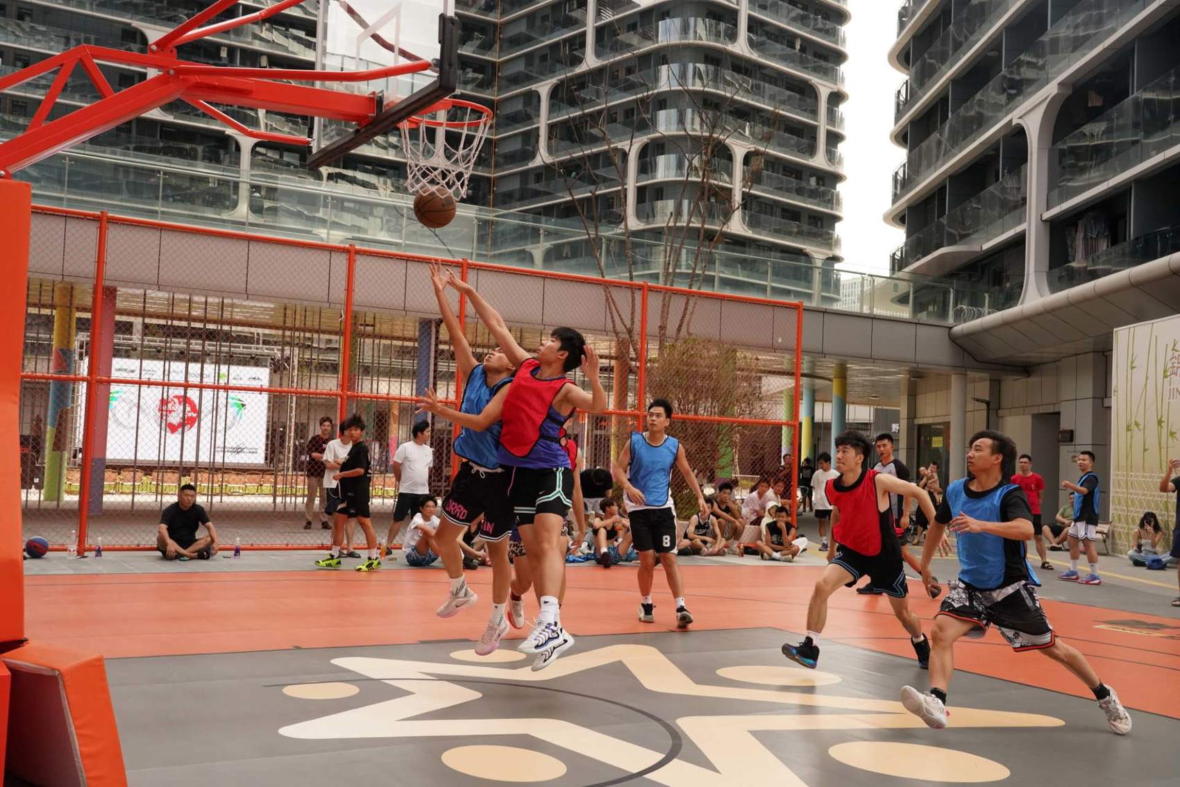 说话间,他身后的篮球场上响起碰撞声、脚步声,穿透街区。带幼儿户外活动的年轻妈妈,指导孩子有模有样学着比划拍球投篮。