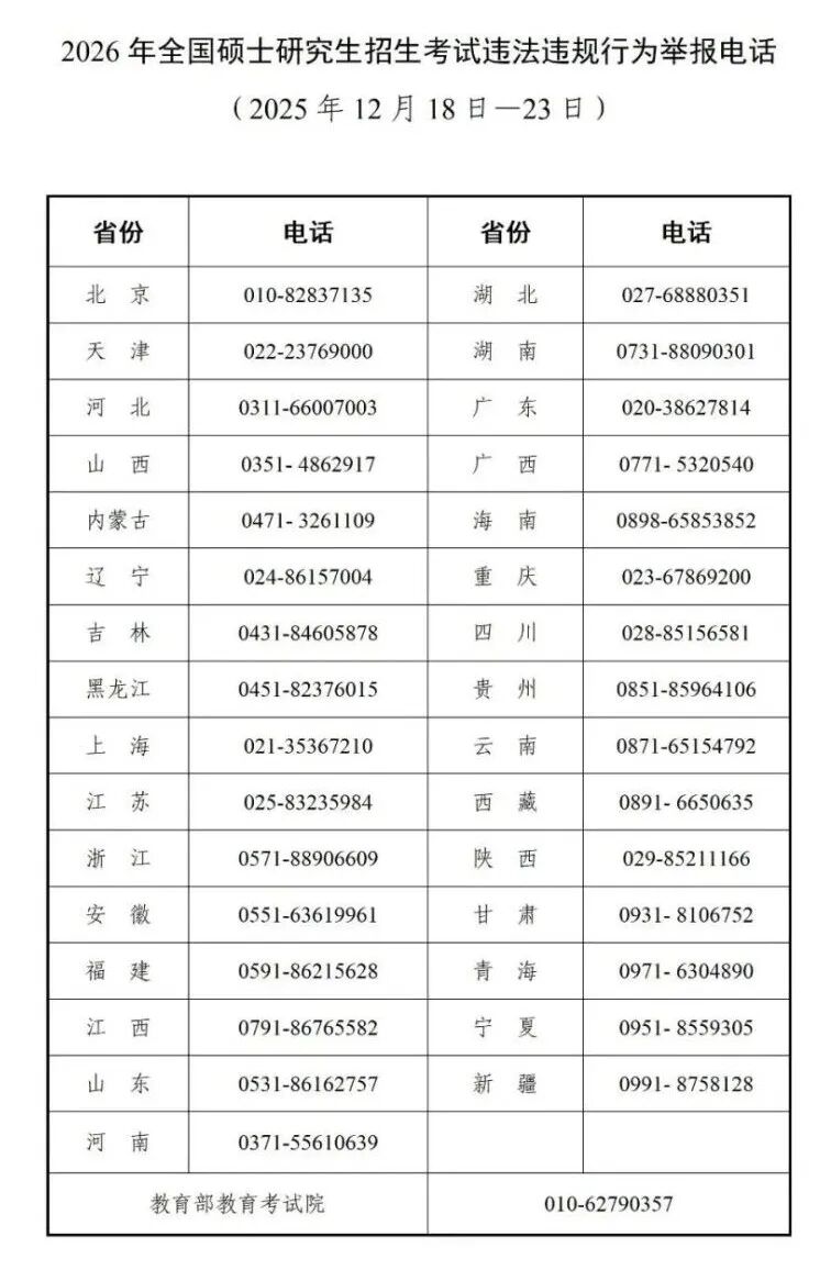 现向社会公布2026年全国硕士研究生招生考试违法违规行为举报电话,欢迎广大考生和公众参与监督。