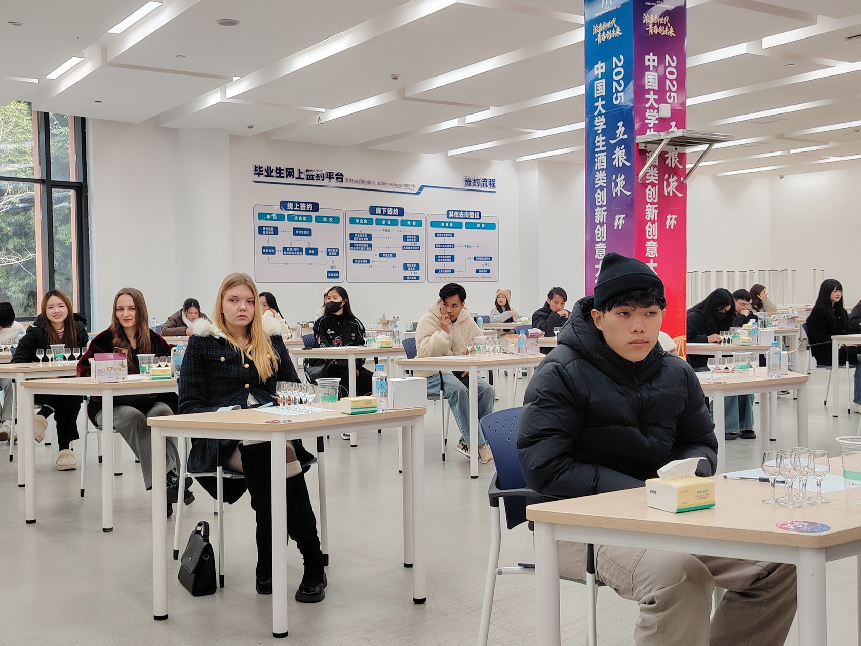 来自俄罗斯、老挝、越南、泰国等国的留学生正对着面前的5杯白酒,认真观察、闻香、品尝,然后在鉴评表上写下感受,有的标注“有点苦”,有的在给5杯酒的好喝程度排序。这是本届大赛专为留学生设置的“国际赛场”,在开放报名的50个名额中,最终有49名学生到场参与。