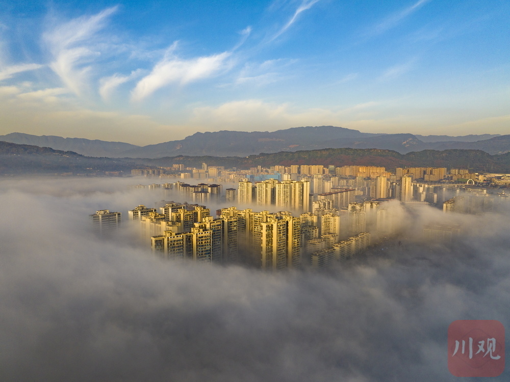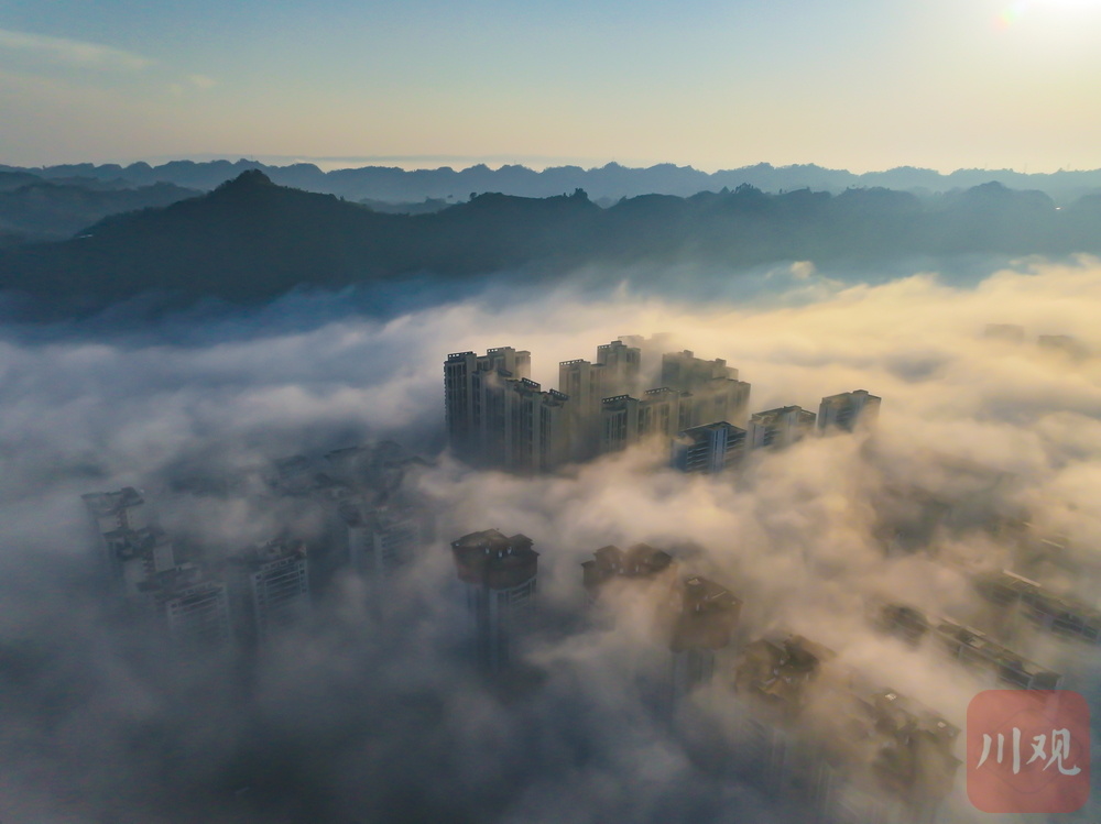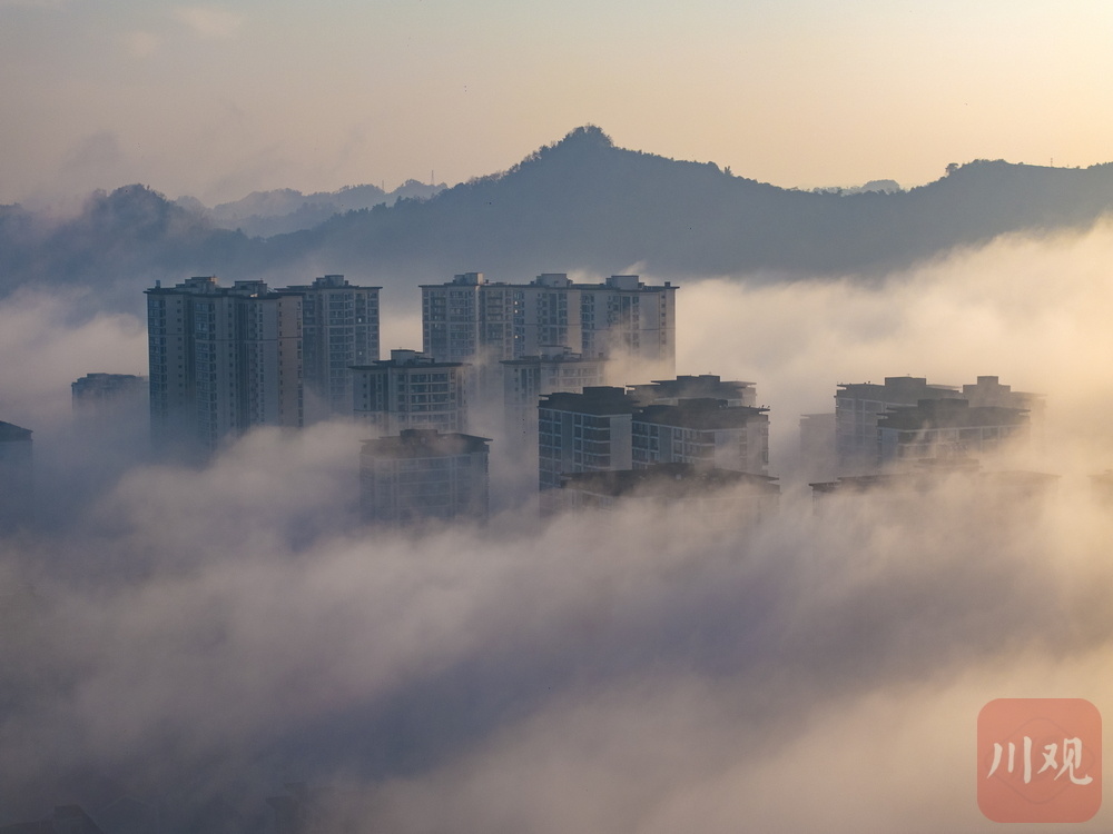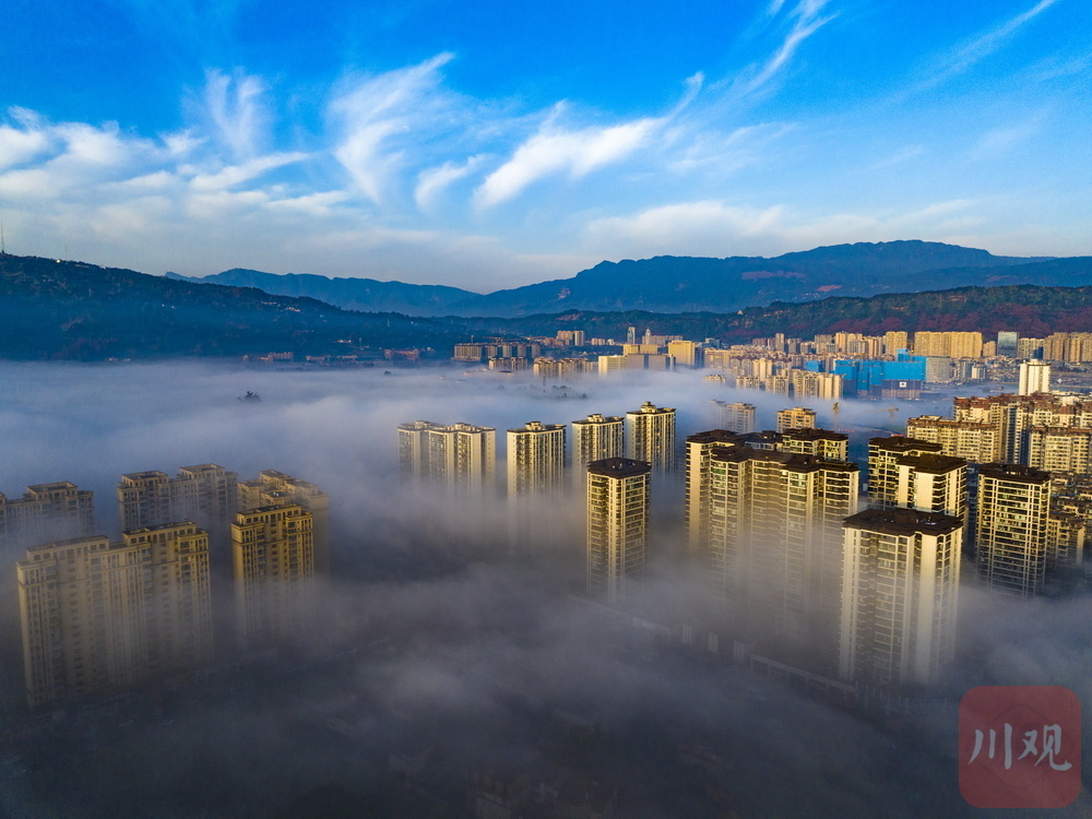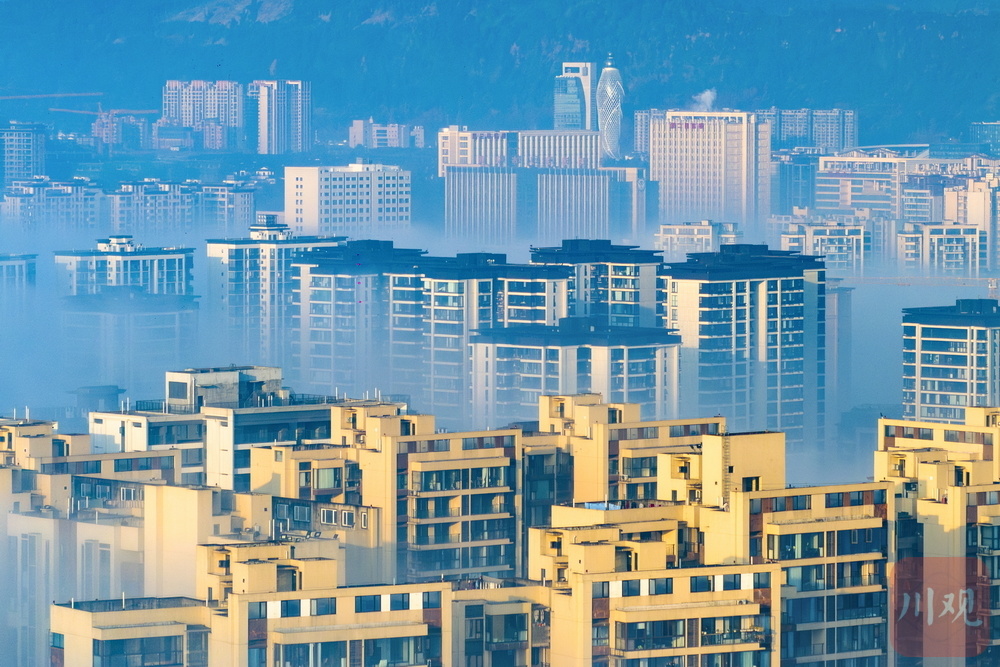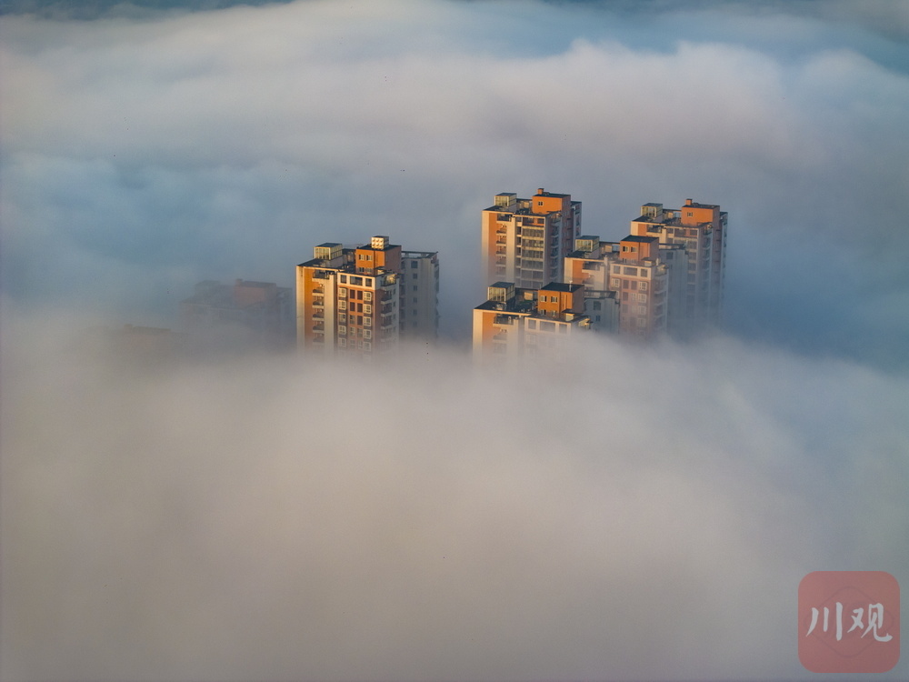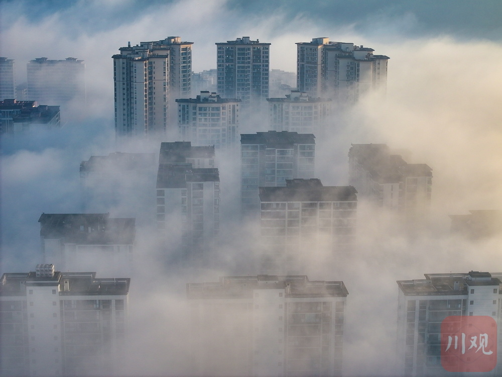 12月17日,雅安市雨城区大兴、草坝等区域再现平流雾景观。置身楼顶望去,一栋栋高层建筑笼罩在“云海”当中,如梦似幻,宛如“天空之城”。