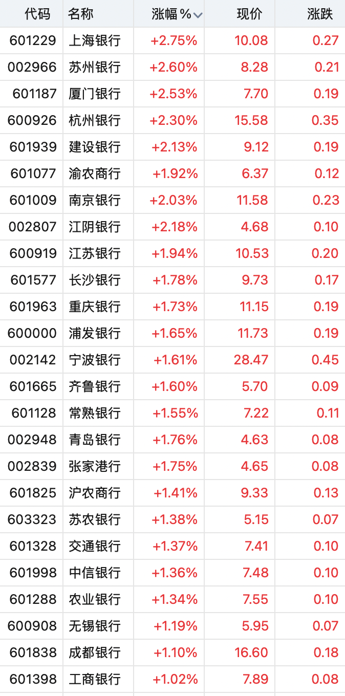 12月18日午后,银行股反弹,板块内全线飘红。上海银行涨近3%,苏州银行、厦门银行、杭州银行涨超2%,建设银行、渝农商行、南京银行、江阴银行涨幅居前。