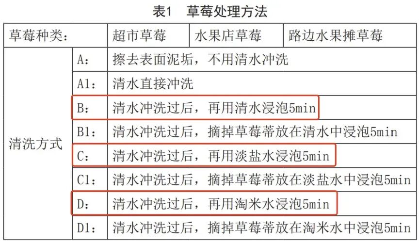 研究人员选取来自超市、水果店及路边摊的草莓样本,每种来源各取3千克,并均分为8份,采用图表中列出的8种清洗方式进行测试,以评估不同方法清除农药残留的效果。