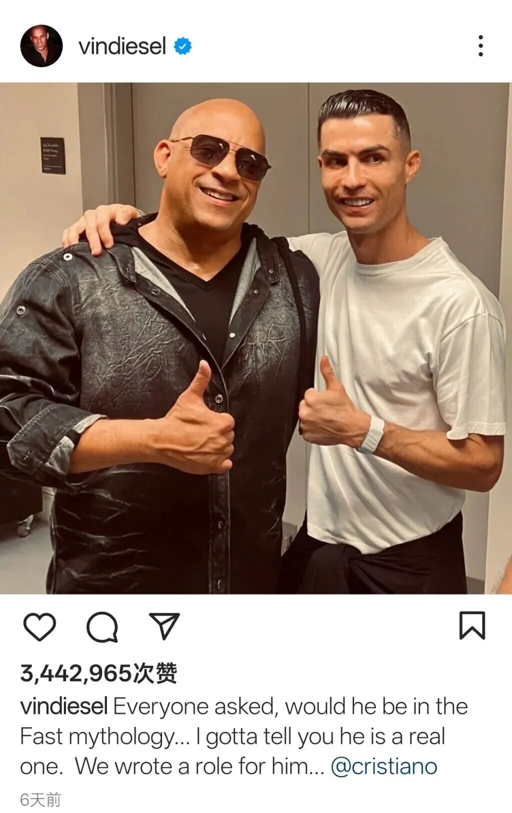 近日,“速度与激情”系列电影主角范·迪塞尔在其社交网站上晒出他与C罗的合照,并配文——“很多人都来问,他是否会加入‘速激’大家庭……我想说,这是真的,我们专门为他安排了一个角色”。范·迪塞尔还在文末艾特了C罗。