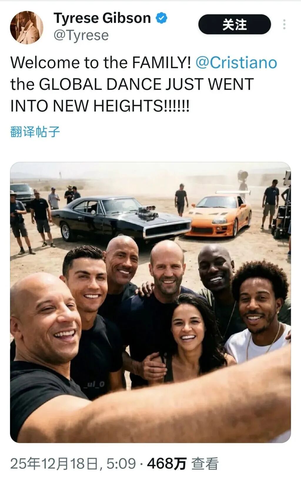 而就在12月18日,在“速激”系列电影里饰演罗曼的泰瑞斯·吉布森在其社交网站上晒出《速度与激情11》剧组工作照,C罗赫然在列。据悉,这是C罗进组拍摄的第一天。