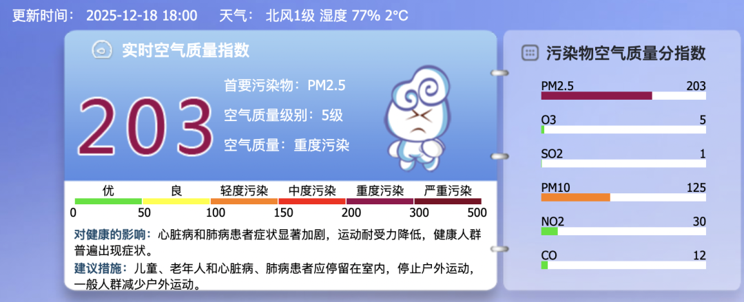 截至12月18日18时,本市空气质量陷入重度污染水平。