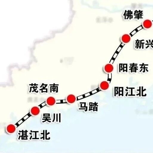 广湛高铁连接广州、佛山、肇庆、云浮、阳江、茂名、湛江等地市,线路全长401公里,设计时速350公里,此次率先开通新兴南、阳春东、阳江北、马踏、茂名南、吴川、湛江北7座车站,两端分别接入广州白云站和湛江北站。广湛高铁佛山站、佛肇站和接入广州站的线路正在有序建设中。