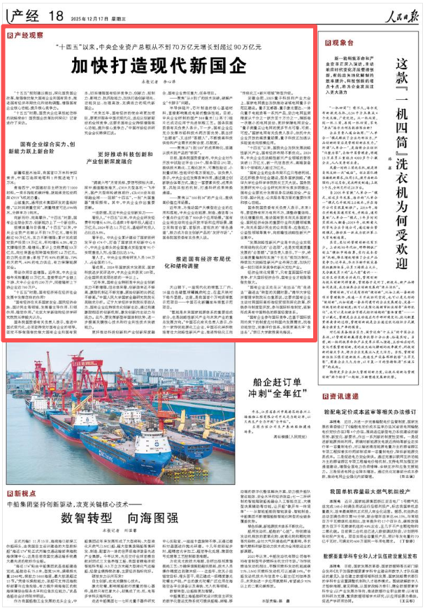 日前,《人民日报》刊发《“十四五”以来,中央企业资产总额从不到70万亿元增长到超过90万亿元——加快打造现代新国企(产经观察)》。文章指出,“十四五”时期,国有企业综合实力、创新能力迈上新台阶,国资央企加快发展战略性新兴产业,国有经济布局不断优化。文章还探讨了“十五五”时期,国资央企应承担起怎样的战略使命、国资国企改革如何深化等问题。小新为您分享全文如下——