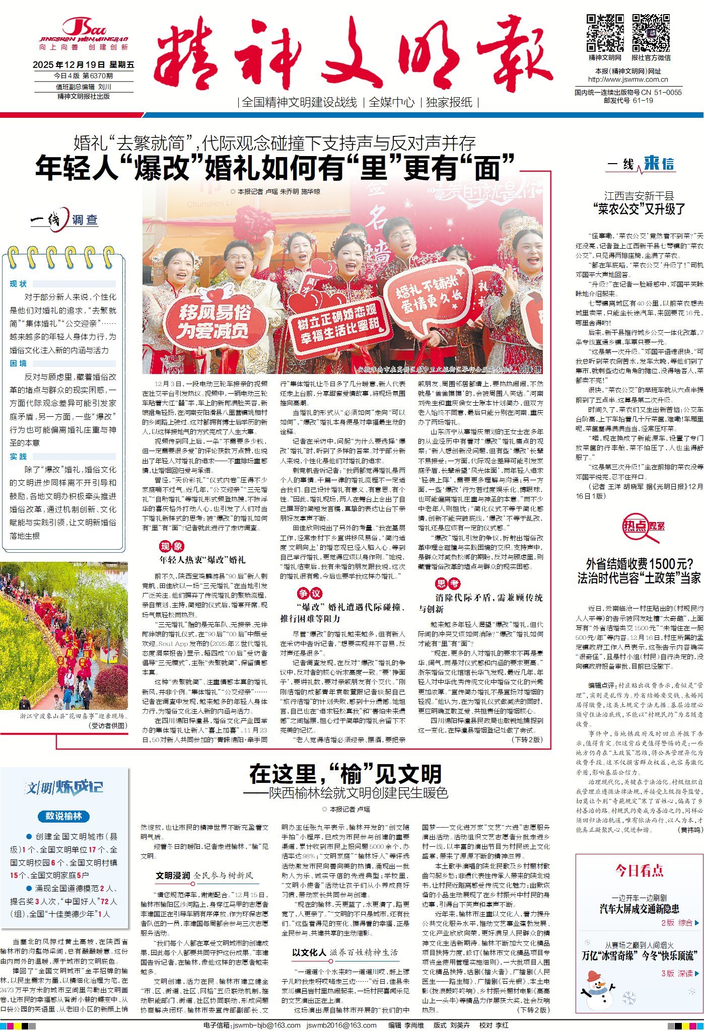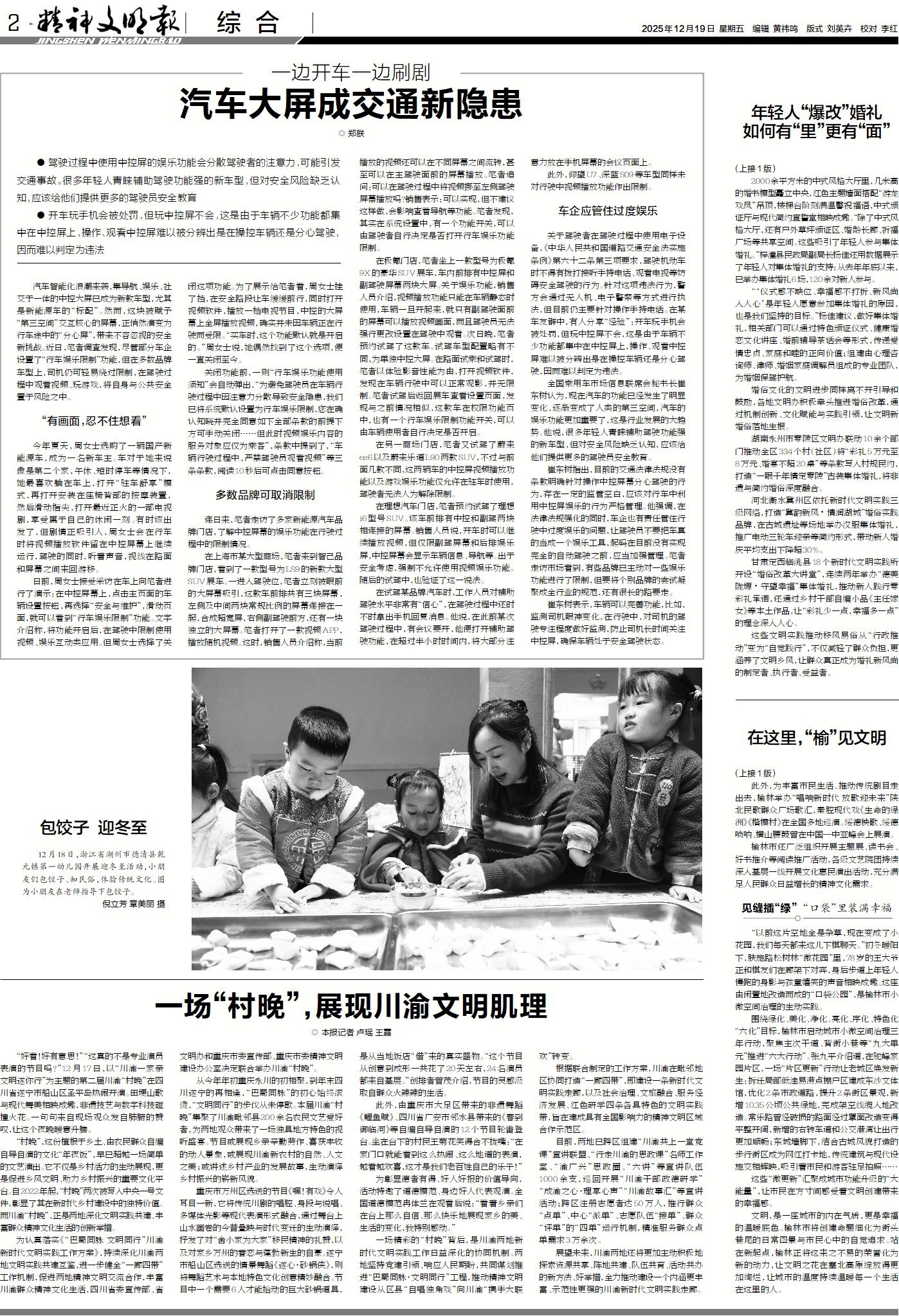 今日版面“早”知道:1版头条关注年轻人“爆改”婚礼,如何做到有“里”有“面”;《热点观察》栏目直击云南临沧一村庄“外省结婚收费1500”等奇葩“村规民约”背后隐藏的“土政策”思维。A2“综合”版头条剑指交通新隐患,聚焦驾驶员开车刷剧,追问汽车中控大屏为何成为“分心屏”。A3“深读”版解锁冰雪经济新密码,探寻冰雪符号从赛场之巅走入人间烟火的进阶之路,解读各地推动冰雪大众化的实干举措。