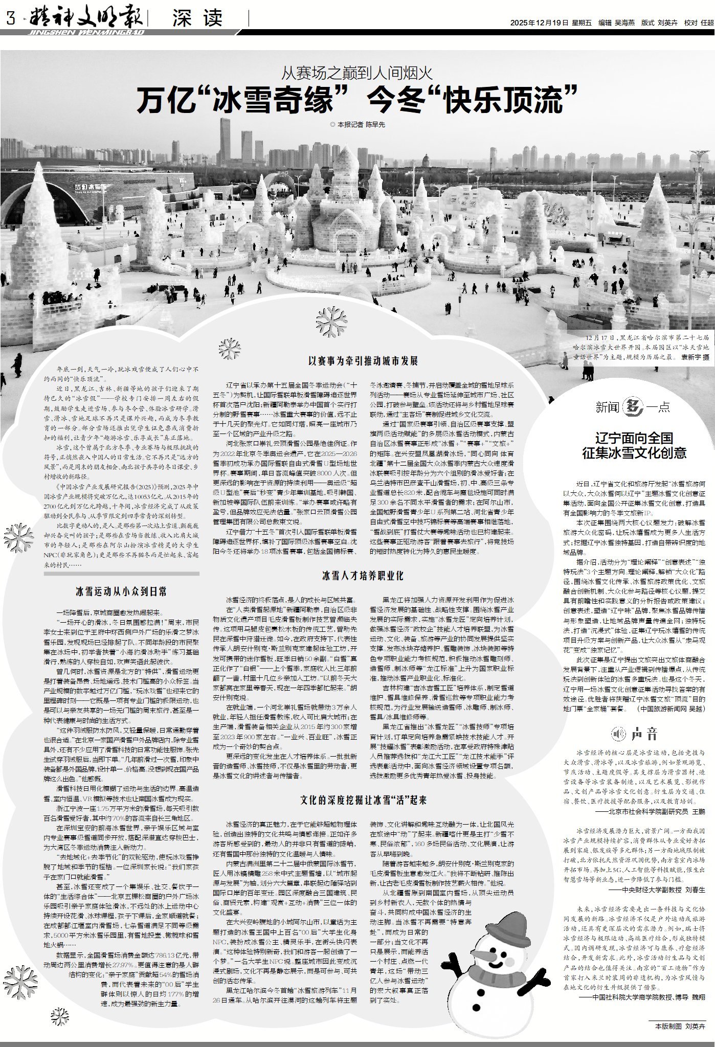 冰雪,这个属于北方冬季、专业赛场与极限挑战的符号,正悄然嵌入中国人的日常生活,冰雪经济也创造了更多的文化共鸣和情感牵连。从人才培养职业化到文化内涵深度挖掘,各地的不懈努力,让冰雪符号完成了从赛场之巅到人间烟火的华丽转身。今日A3版“深读”,带你见证冰雪的“破圈”之旅。