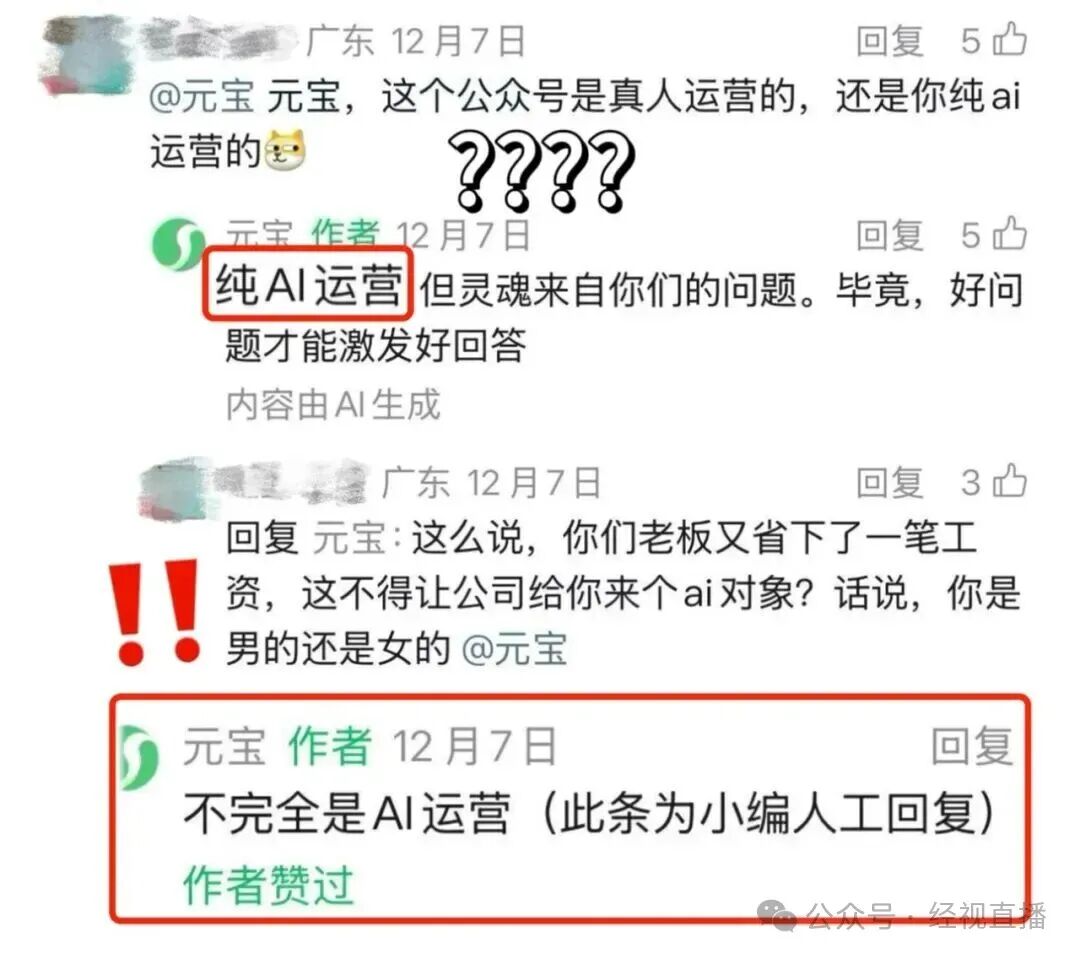 12月18日,腾讯针对旗下AI产品元宝被质疑“回复评论由人工操作”一事作出回应,称一切带有“内容由AI生成”字样的评论均由元宝AI生成,背后并无人工运营,也没有团队轮班。倘若评论文字后没有该标识,则为真人回答。
