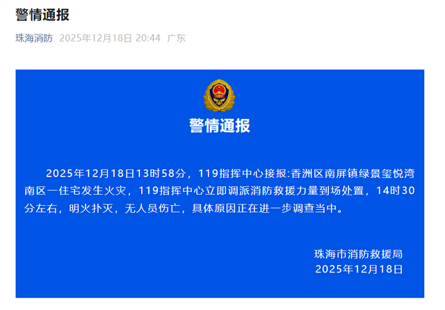 2025年12月18日13时58分,119指挥中心接报:香洲区南屏镇绿景玺悦湾南区一住宅发生火灾,119指挥中心立即调派消防救援力量到场处置,14时30分左右,明火扑灭,无人员伤亡,具体原因正在进一步调查当中。