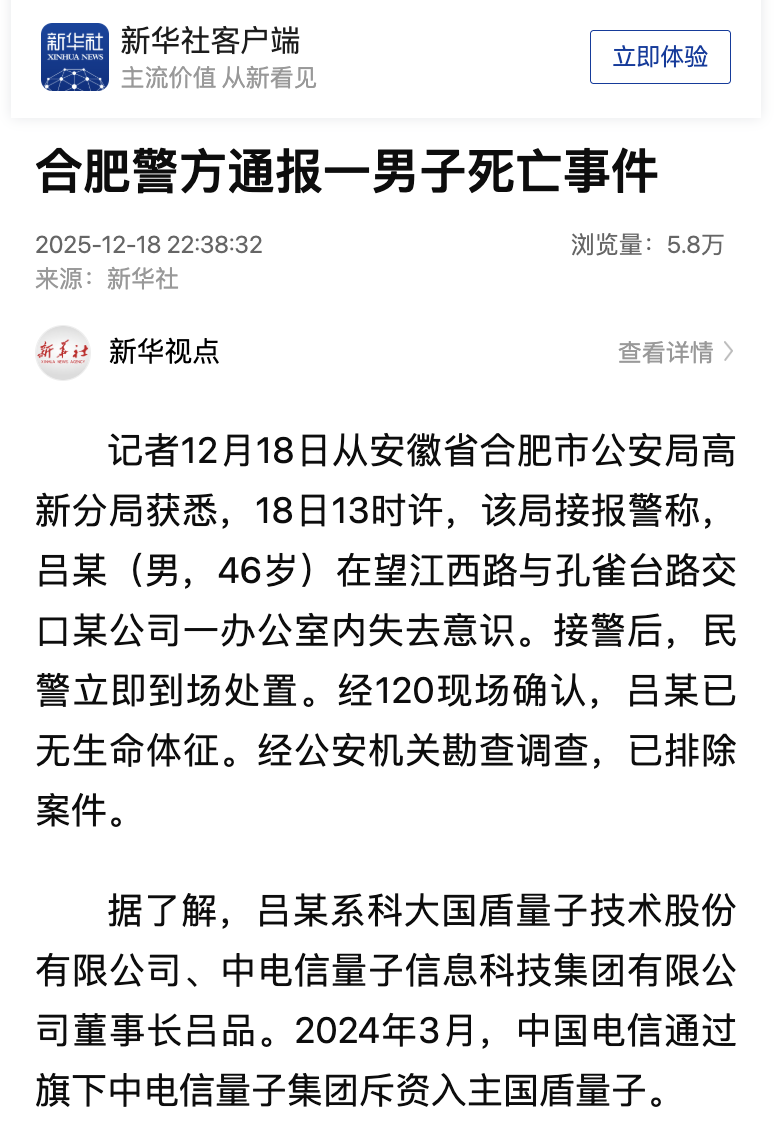 另据新华社消息,据了解,吕某系科大国盾量子技术股份有限公司、中电信量子信息科技集团有限公司董事长吕品。2024年3月,中国电信通过旗下中电信量子集团斥资入主国盾量子。