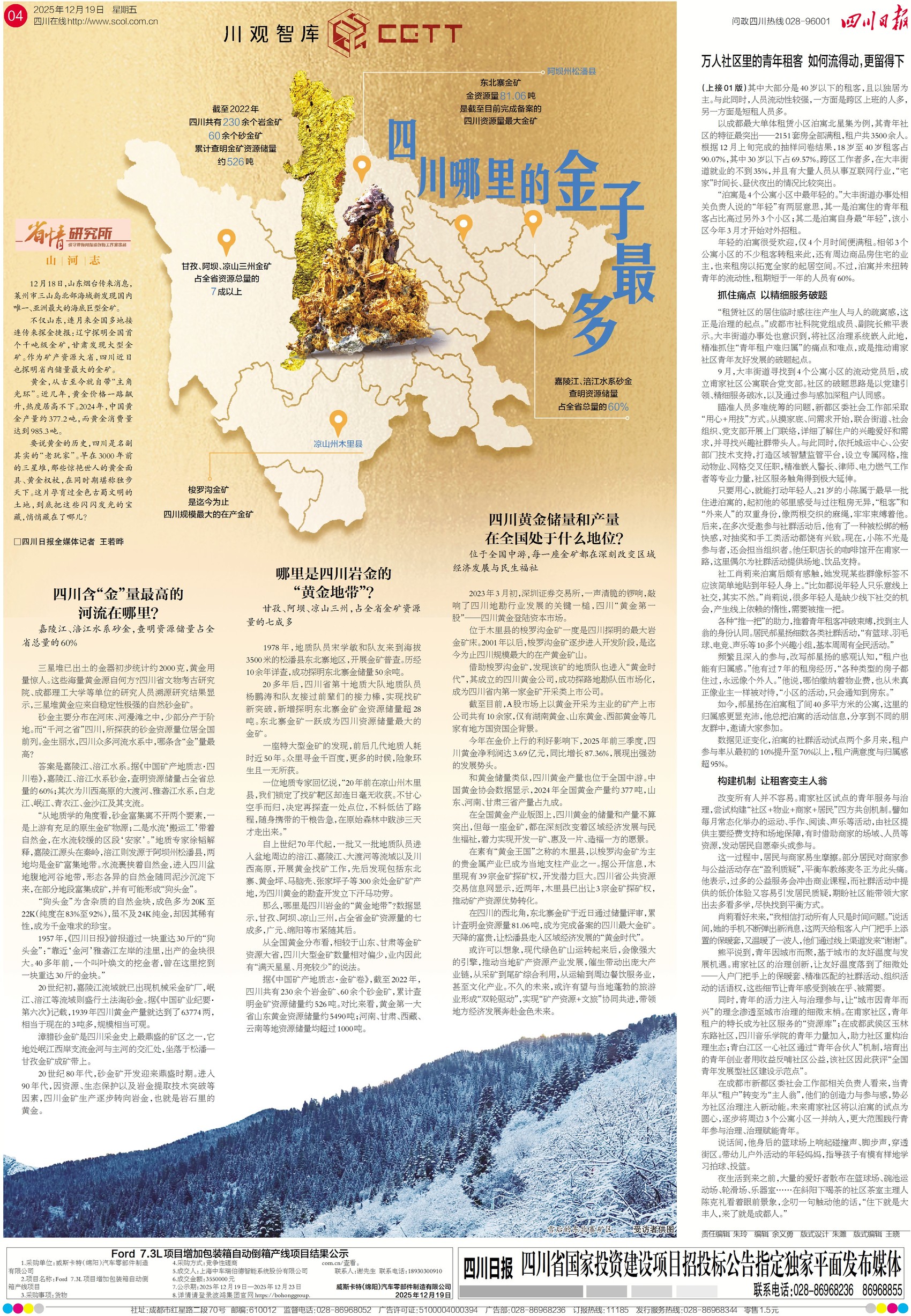 近日,位于阿坝州松潘县的东北寨金矿通过储量评审,累计查明金资源量81.06吨,成为完成备案的四川最大金矿。作为黄金领域的“老玩家”,四川通过市场化开发和绿色矿山建设,不仅实现黄金产业突破,还致力于将矿产资源优势转化为民生福祉,正探索“矿产资源+文旅”融合发展的金色未来。关注四版,看四川黄金都藏在哪儿。