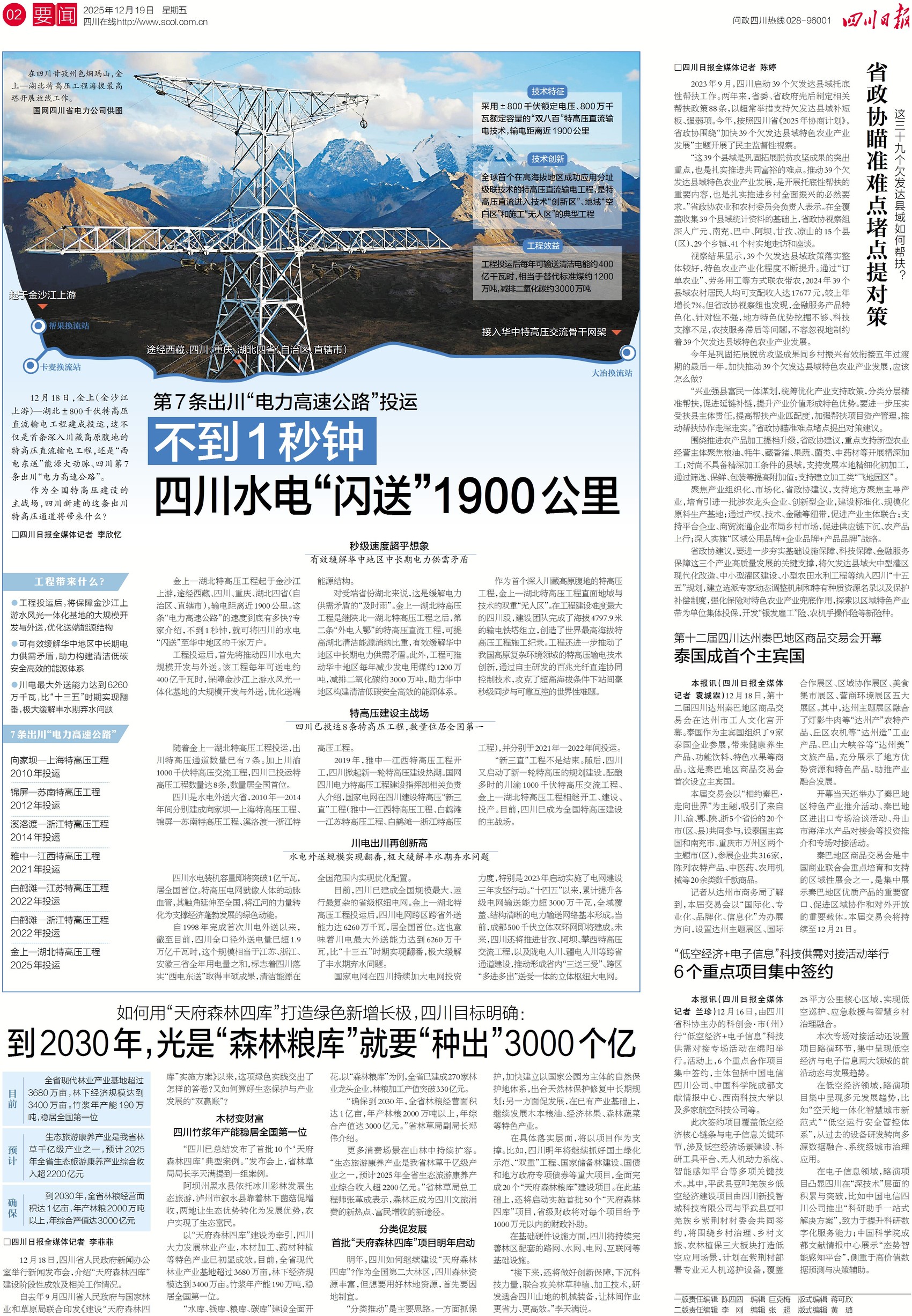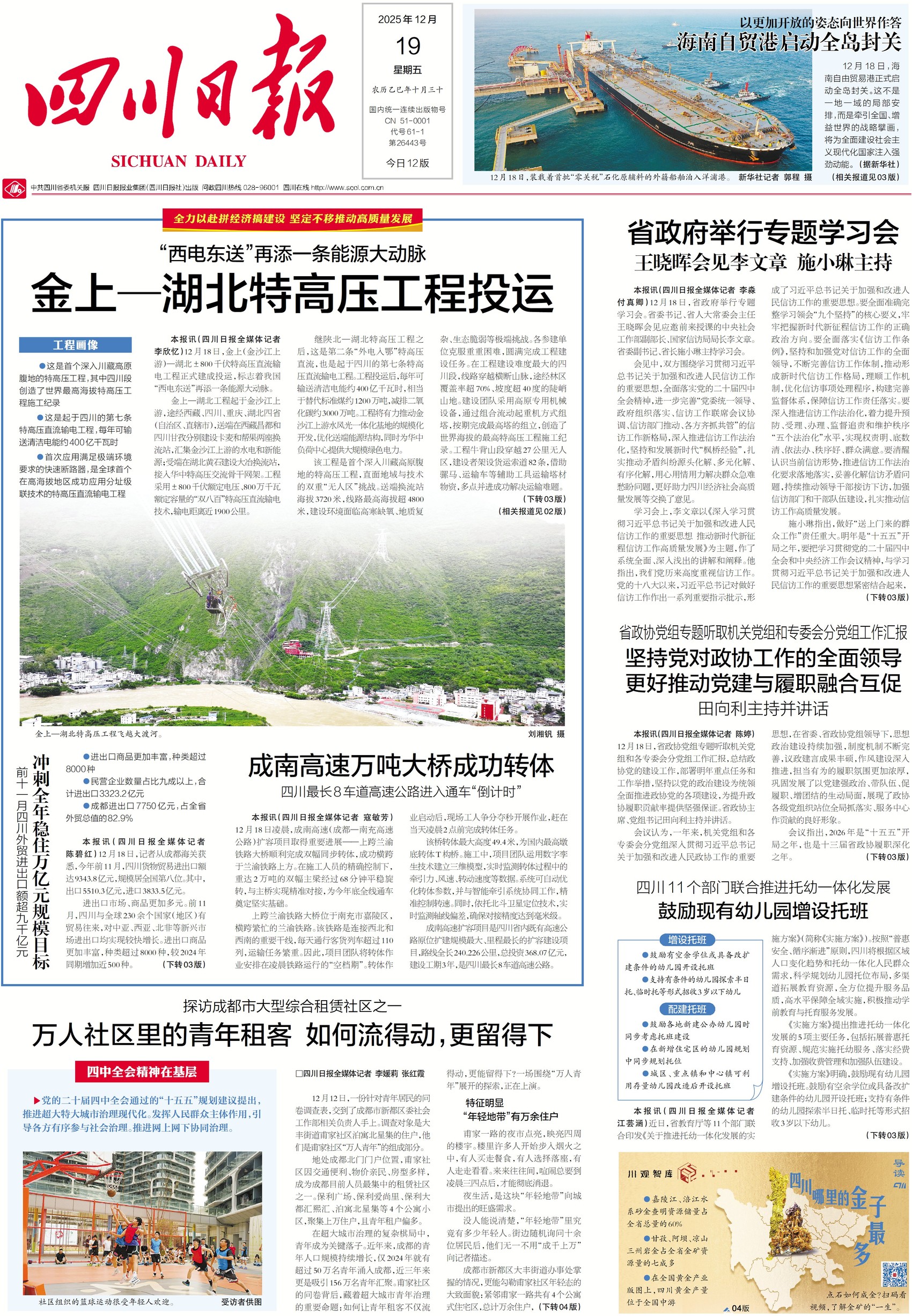 12月18日,金上—湖北特高压工程建成投运。这是我国“西电东送”新动脉、首个深入川藏高原腹地的特高压工程,途经四个省份、输电距离近1900公里,每年可输送清洁电能约400亿千瓦时,助力四川水电开发外送、缓解华中电力供应压力。至此,四川已投运8条特高压工程,居全国首位。关注一版二版,感受这条大动脉的厉害。