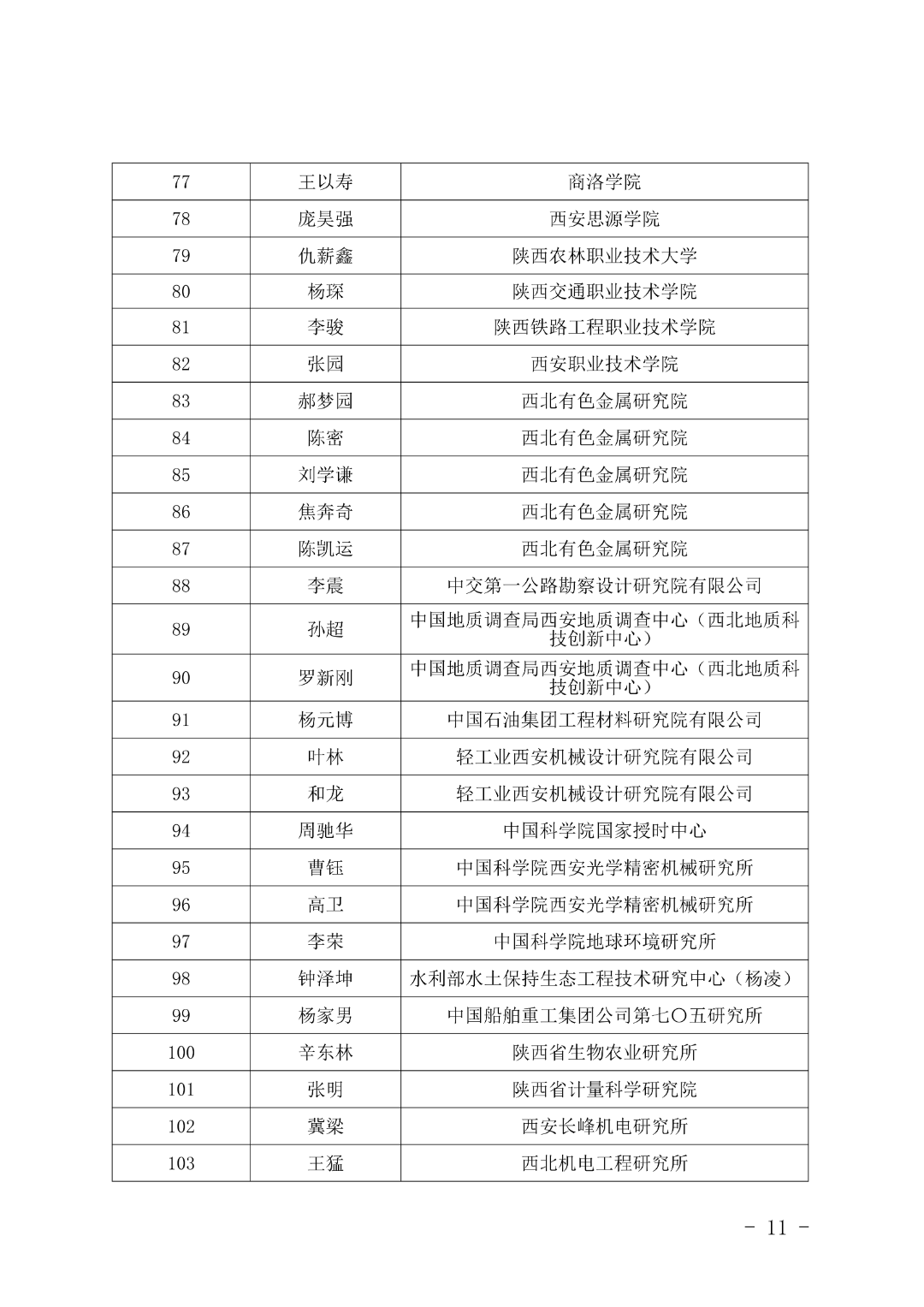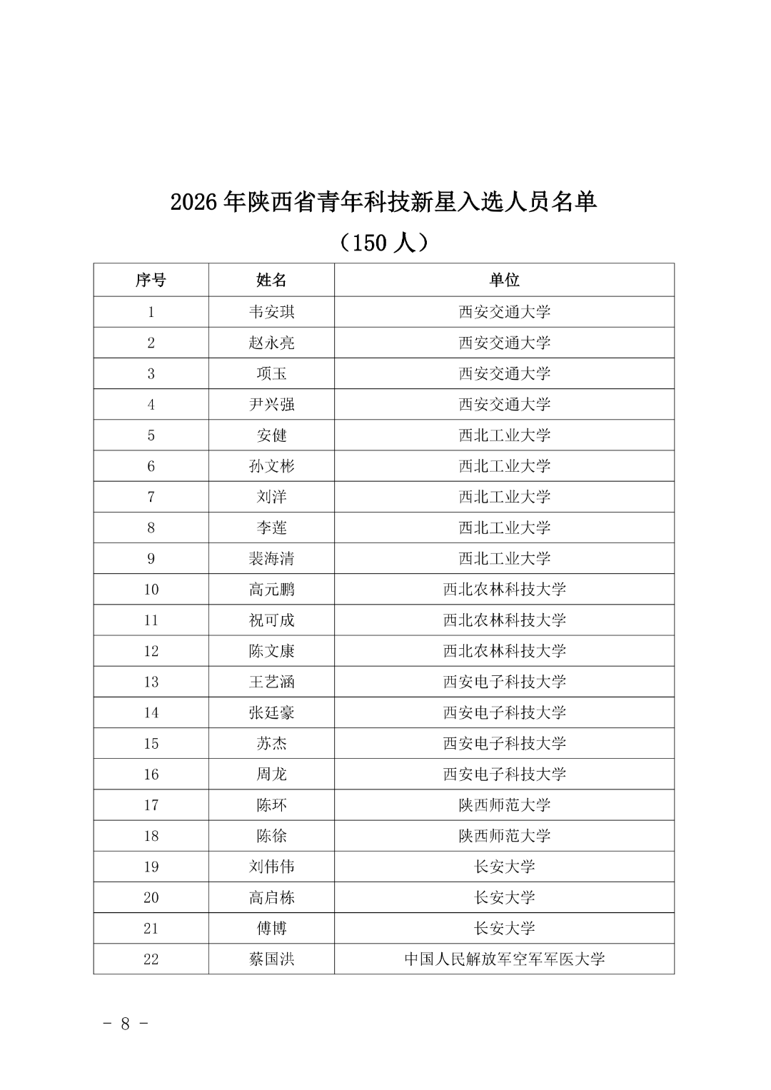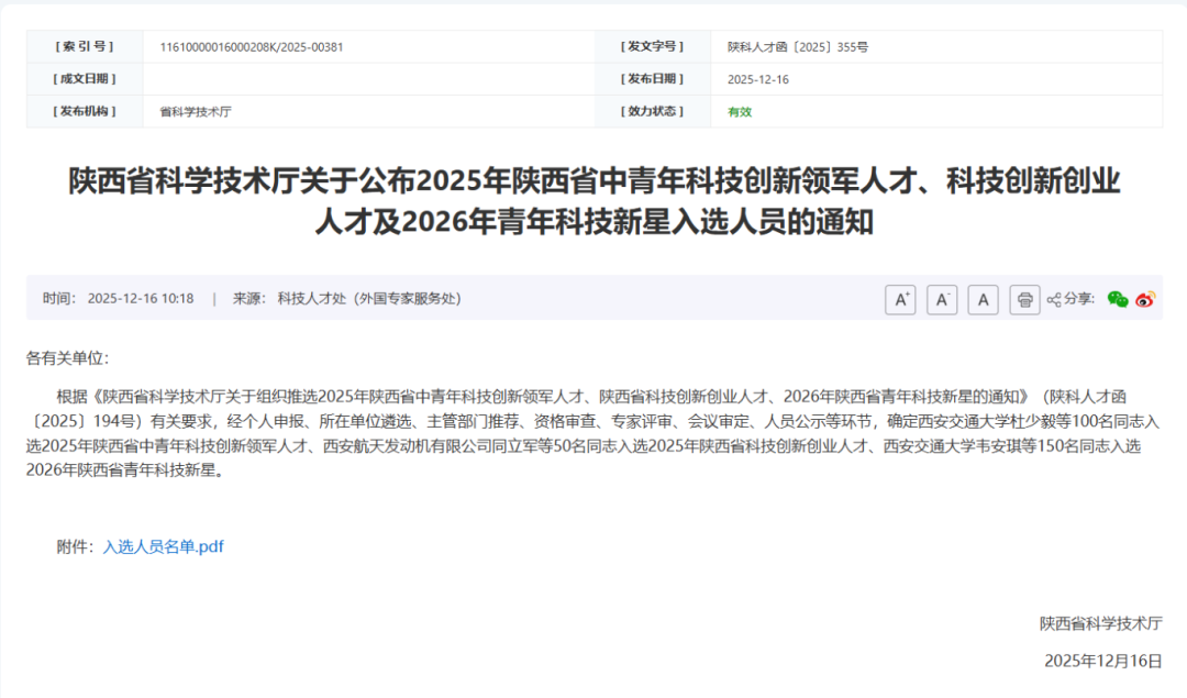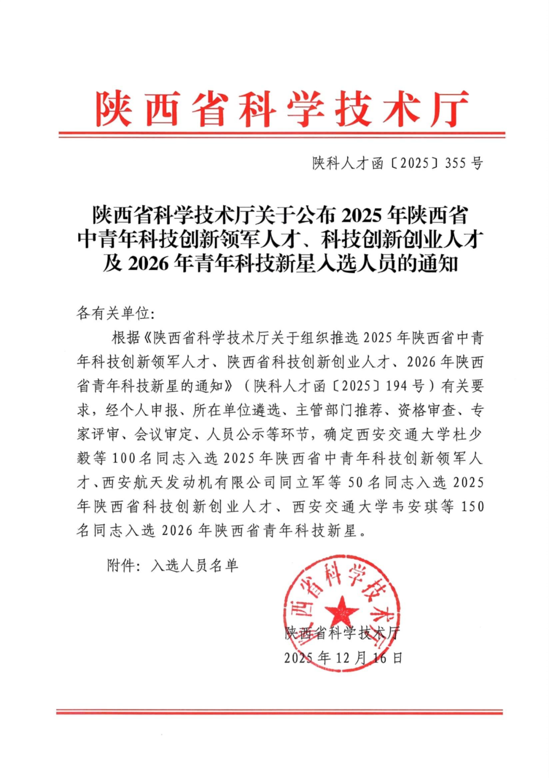 据了解,此次评选根据《陕西省科学技术厅关于组织推选2025年陕西省中青年科技创新领军人才、陕西省科技创新创业人才、2026年陕西省青年科技新星的通知》有关要求,经个人申报、所在单位遴选、主管部门推荐、资格审查、专家评审、会议审定、人员公示等环节,最终确定西安交通大学杜少毅等100名同志入选2025年陕西省中青年科技创新领军人才、西安航天发动机有限公司同立军等50名同志入选2025年陕西省科技创新创业人才、西安交通大学韦安琪等150名同志入选2026年陕西省青年科技新星。